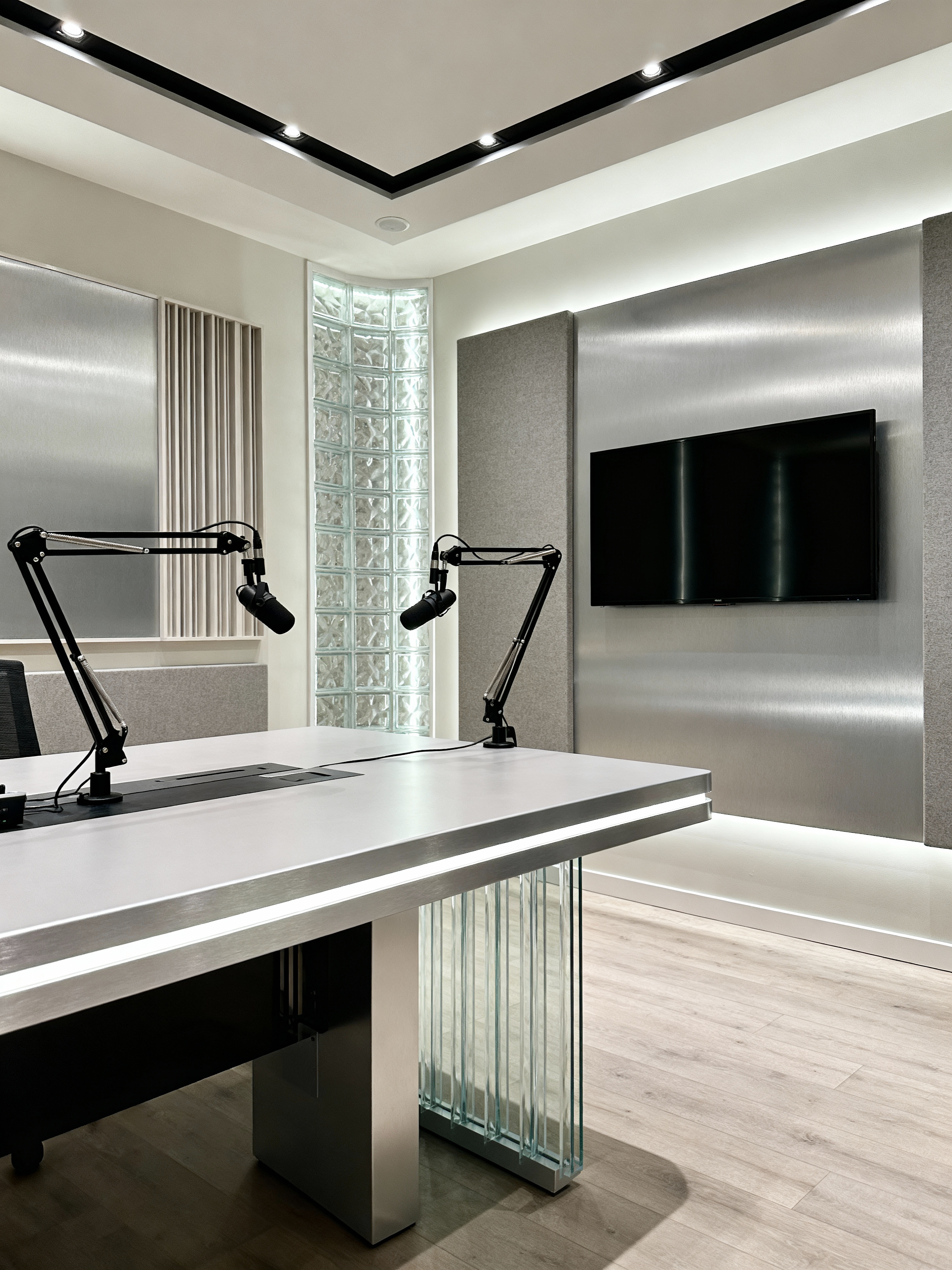 podcast studio with contemporary style with radio station studio and sturdy desk and talk show interior and talk show studio and acoustic soundproofing panels for damping sound and wall mounted television and 2 microphone stands and radio show studio. . with clean look and glass decor and minimalist and open spaces and sleek lines and modern finishes and elegant simplicity and metal accents