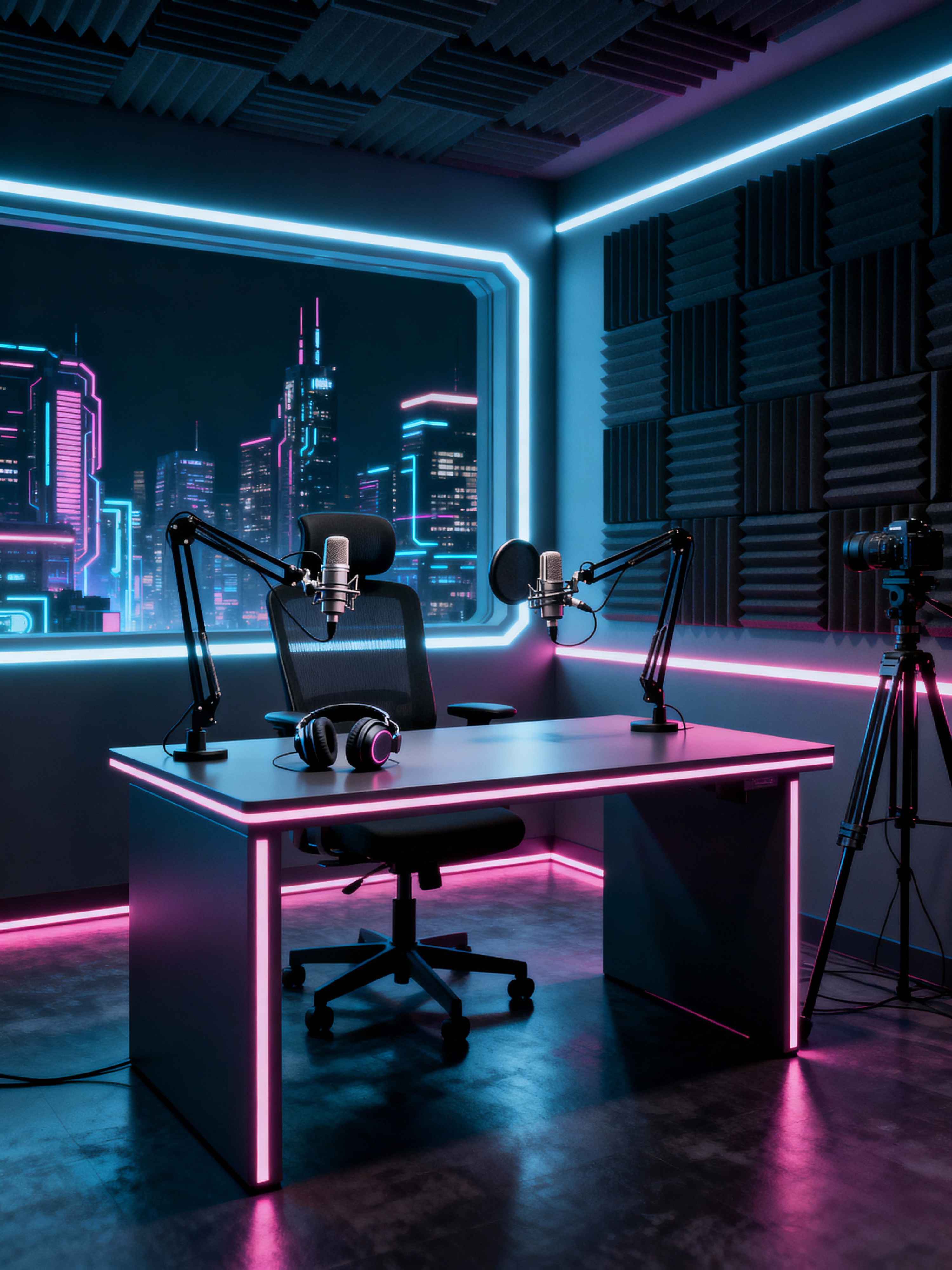 podcast studio with cyberpunk style with headphones on table and 2 microphone stands and sturdy desk and camera on tripod and talk show interior and comfortable podcast chair and acoustic soundproofing panels for damping sound and radio station studio. . with cyberpunk lights and synthwave and strong geometric walls and minimalist and futuristic cybernetic city and led lights and cyberpunk style and dark night