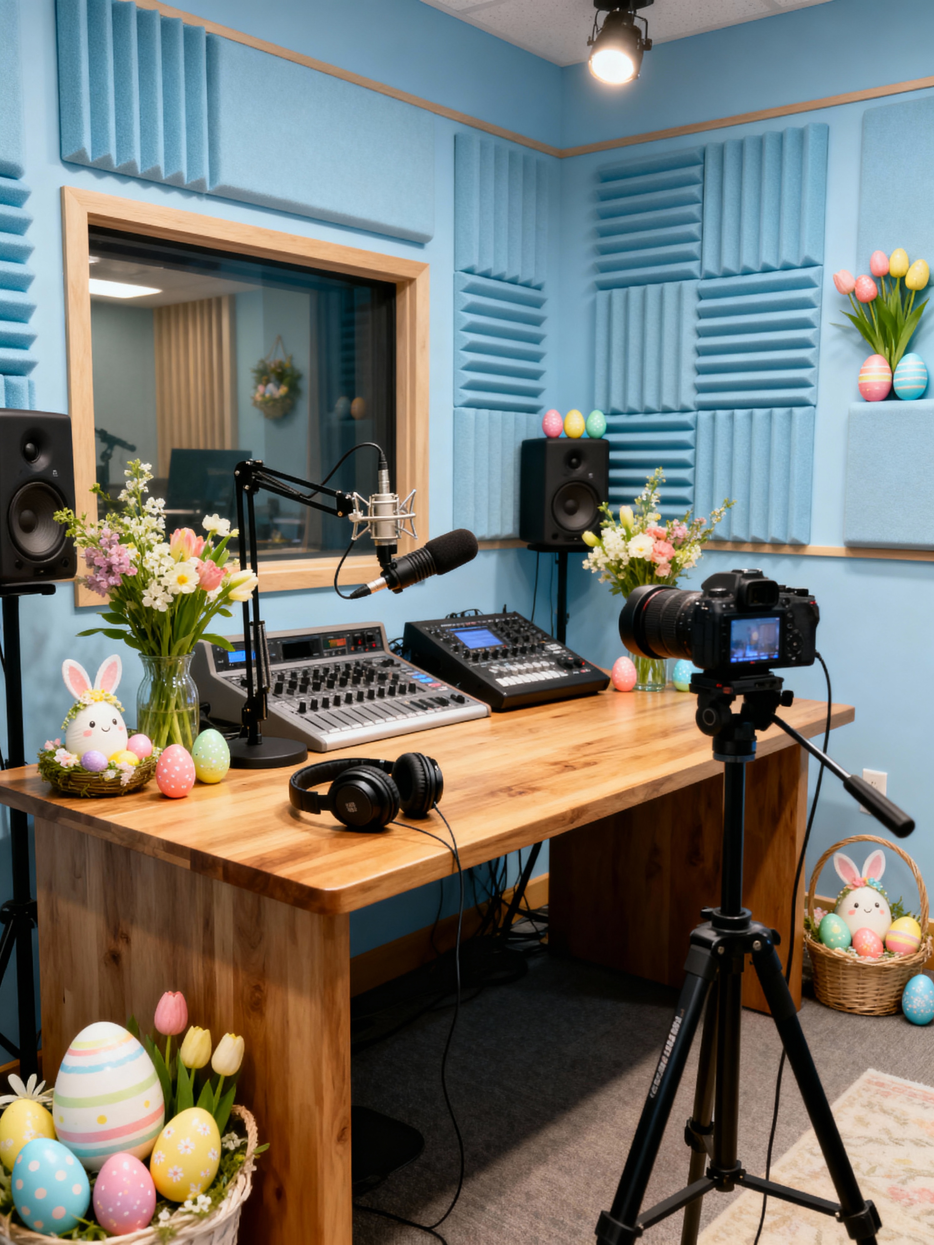 podcast studio with easter style with acoustic soundproofing panels for damping sound and sturdy desk and talk show interior and talk show interior and headphones on table and camera on tripod and radio station studio and radio station studio. . with spring decorations and flowers on table and easter decorations and colorful easter eggs and light blue colors and spring decorations