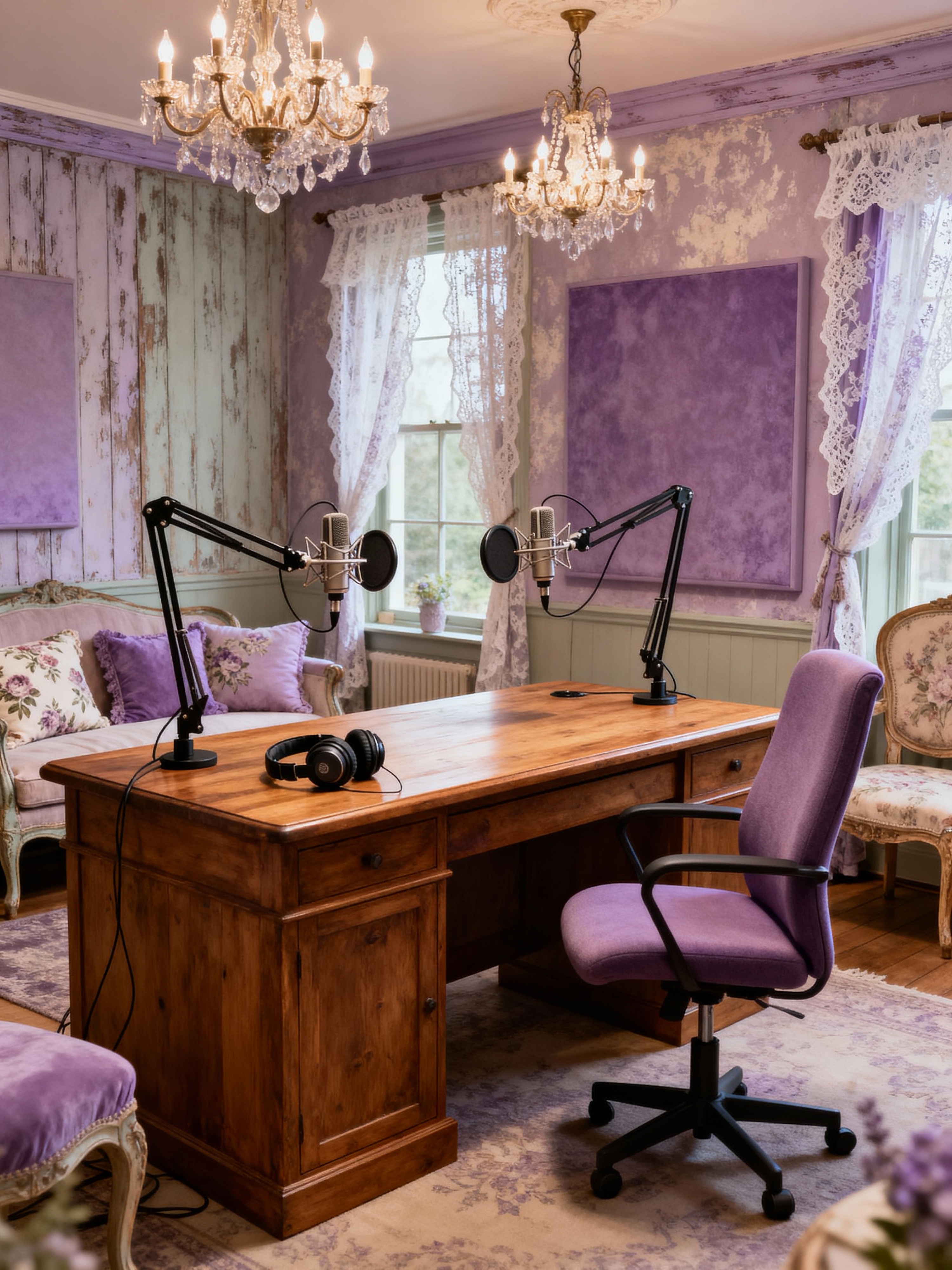 podcast studio with french country style with radio station studio and sturdy desk and comfortable podcast chair and talk show studio and soft lighting and 2 microphone stands and radio station studio and headphones on table. . with soft fabrics and ornate details and lavender accents and vintage furniture and warm tones and chandeliers and textured walls and distressed wood