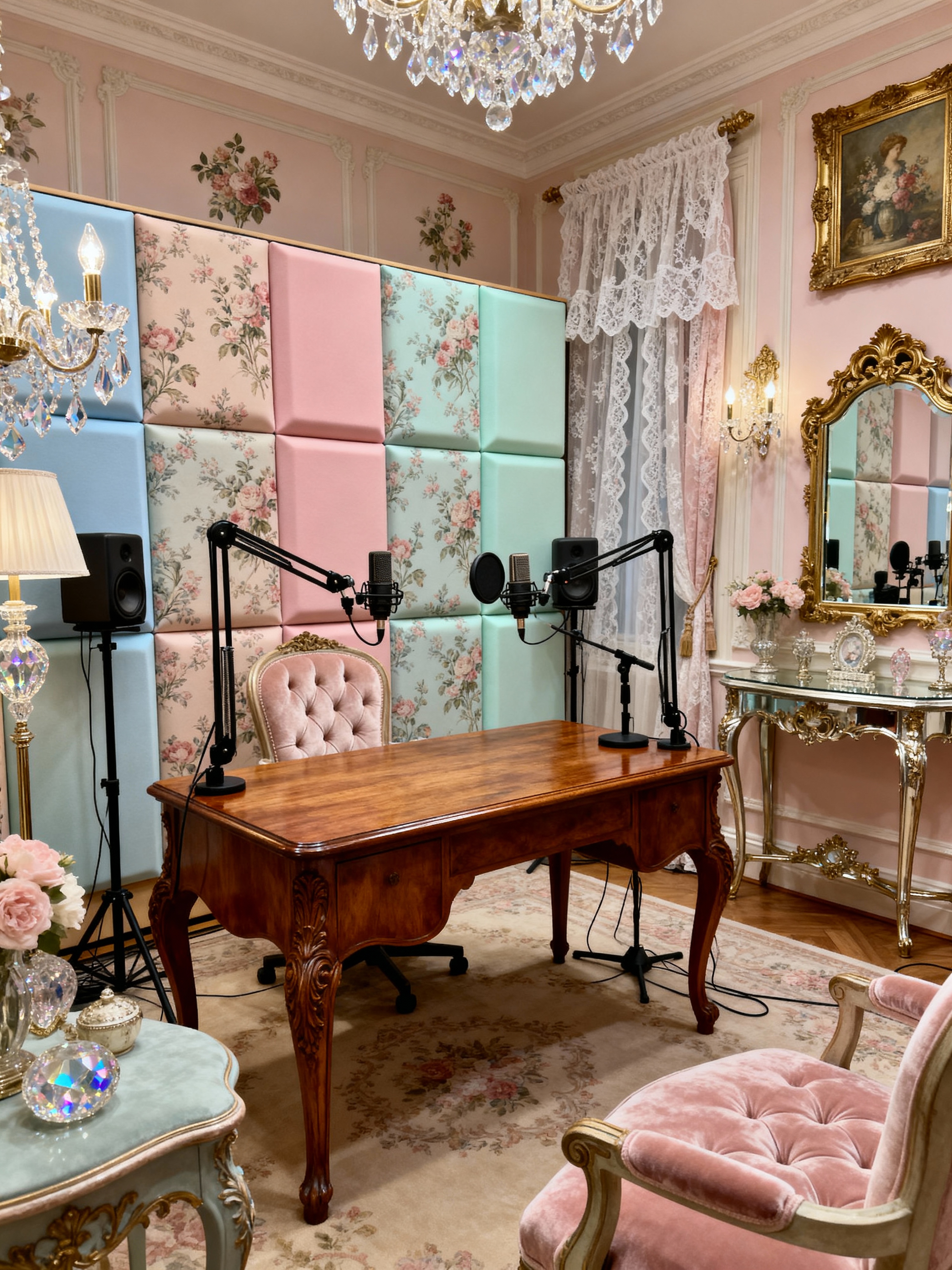 podcast studio with french style with radio show studio and radio station studio and talk show studio and talk show studio and sturdy desk and talk show studio and talk show interior and acoustic soundproofing panels for damping sound. . with elegant details and refined luxury and romantic style and crystal accents and toile patterns and ornate furniture and soft pastels and classic beauty