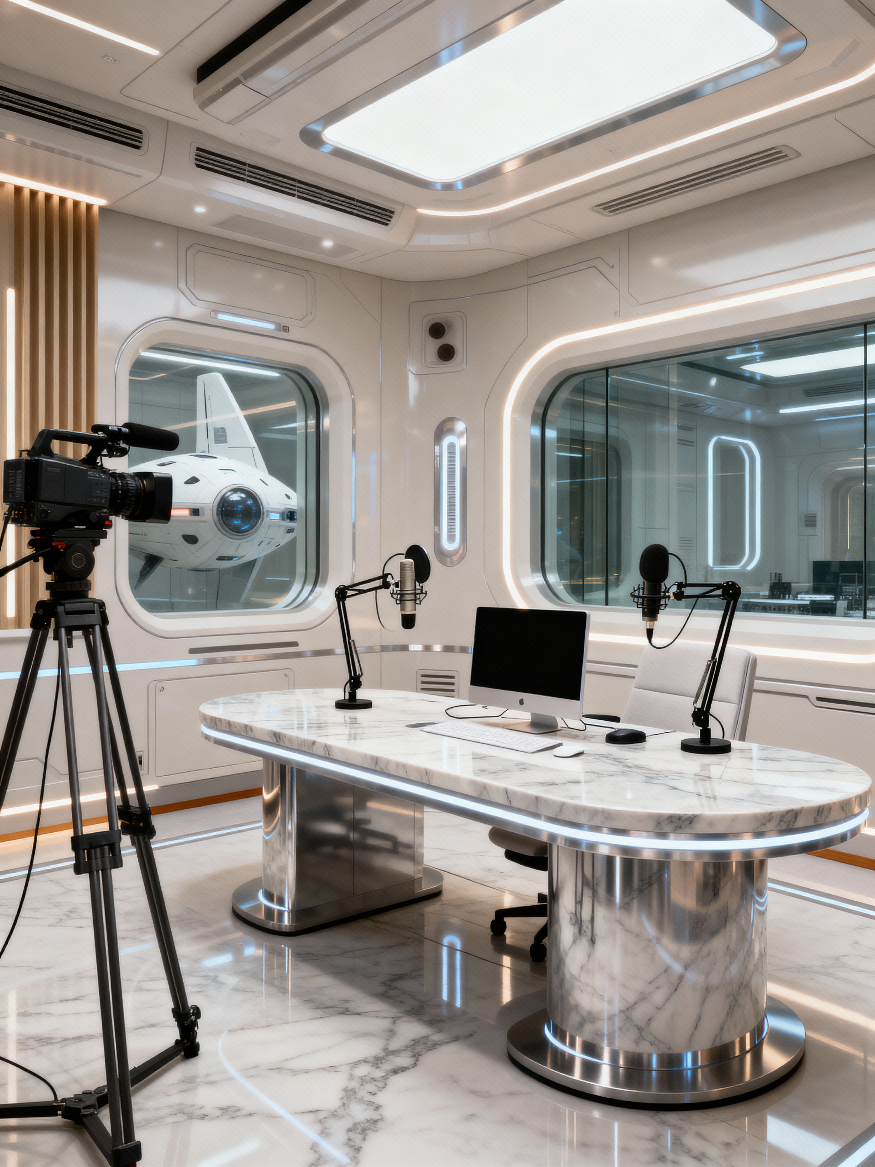 podcast studio with futuristic style with camera on tripod and soft lighting and talk show interior and 2 microphone stands and computer and talk show studio and radio station studio and talk show studio. . with neutral background and bright accents and steel finishing and light colors and smooth marble and spaceship interior and smooth polished marble and futurism and glass panes