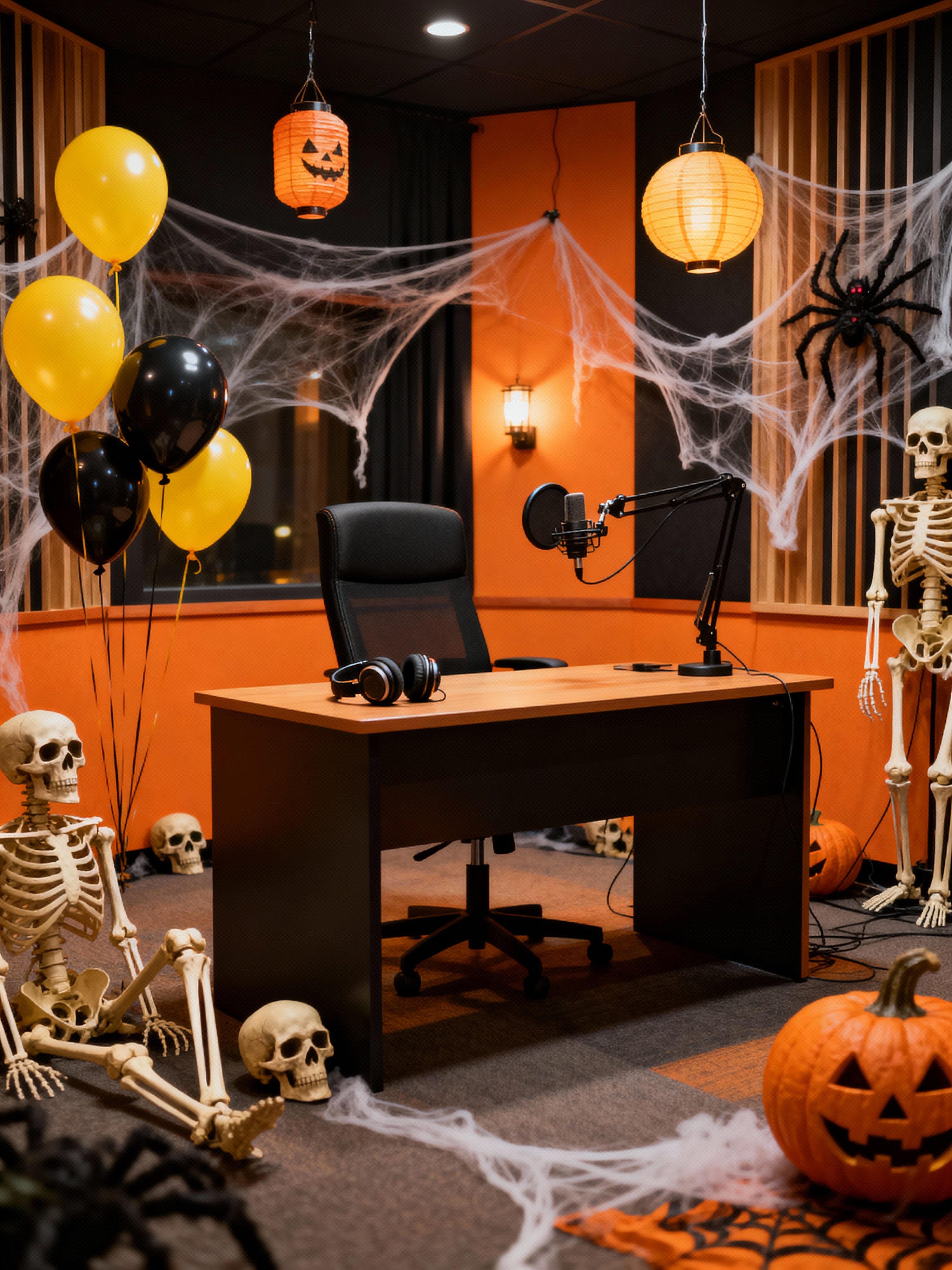 podcast studio with halloween style with comfortable podcast chair and headphones on table and talk show studio and radio show studio and radio station studio and radio station studio and talk show studio and sturdy desk. . with yellow black balloons and lanterns and cobwebs and cobwebs and lanterns and skeletons sitting and standing and human skulls and spiderwebs
