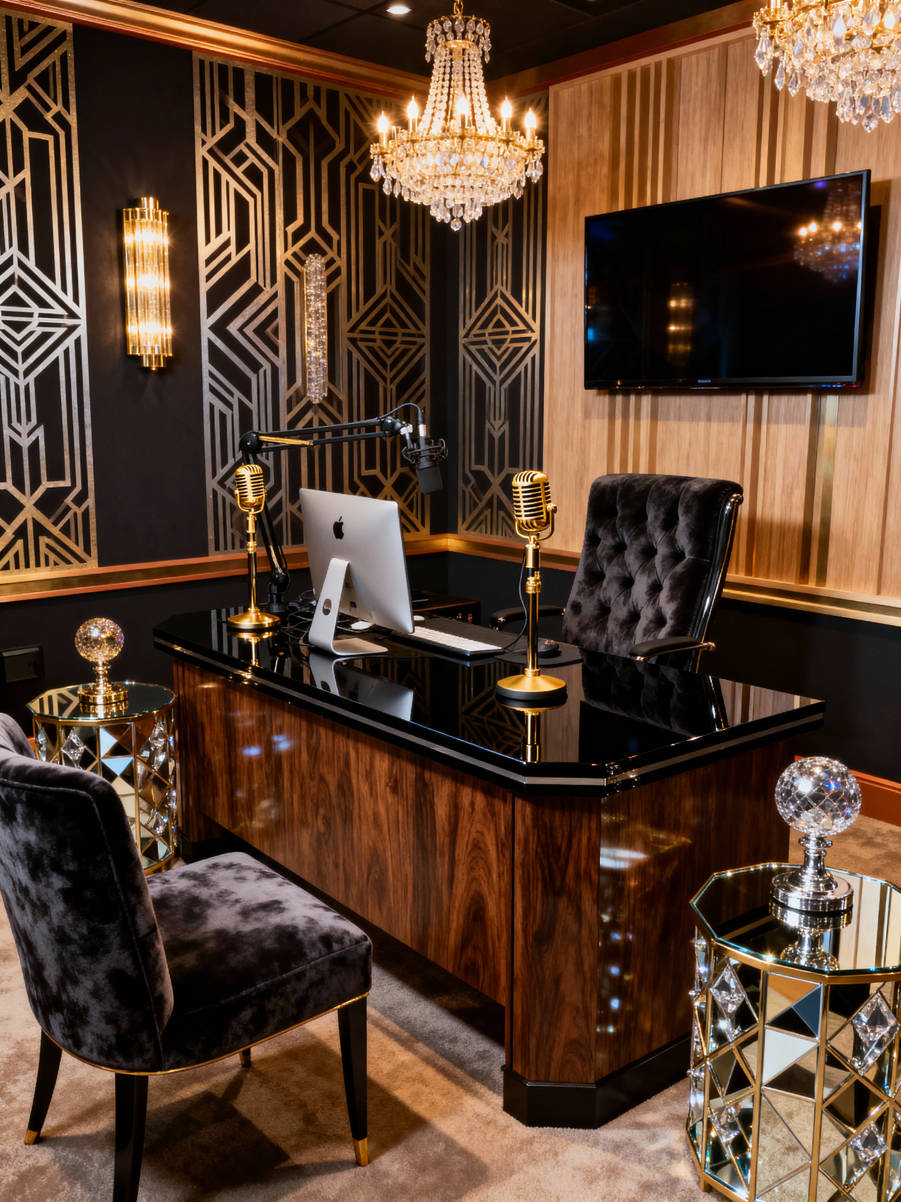 podcast studio with hollywood glam style with talk show interior and radio show studio and radio station studio and talk show interior and computer and wall mounted television and 2 microphone stands and sturdy desk. . with opulent details and luxurious fabrics and metallic accents and art deco influence and dramatic lighting and crystal chandeliers and mirrored surfaces and velvet upholstery