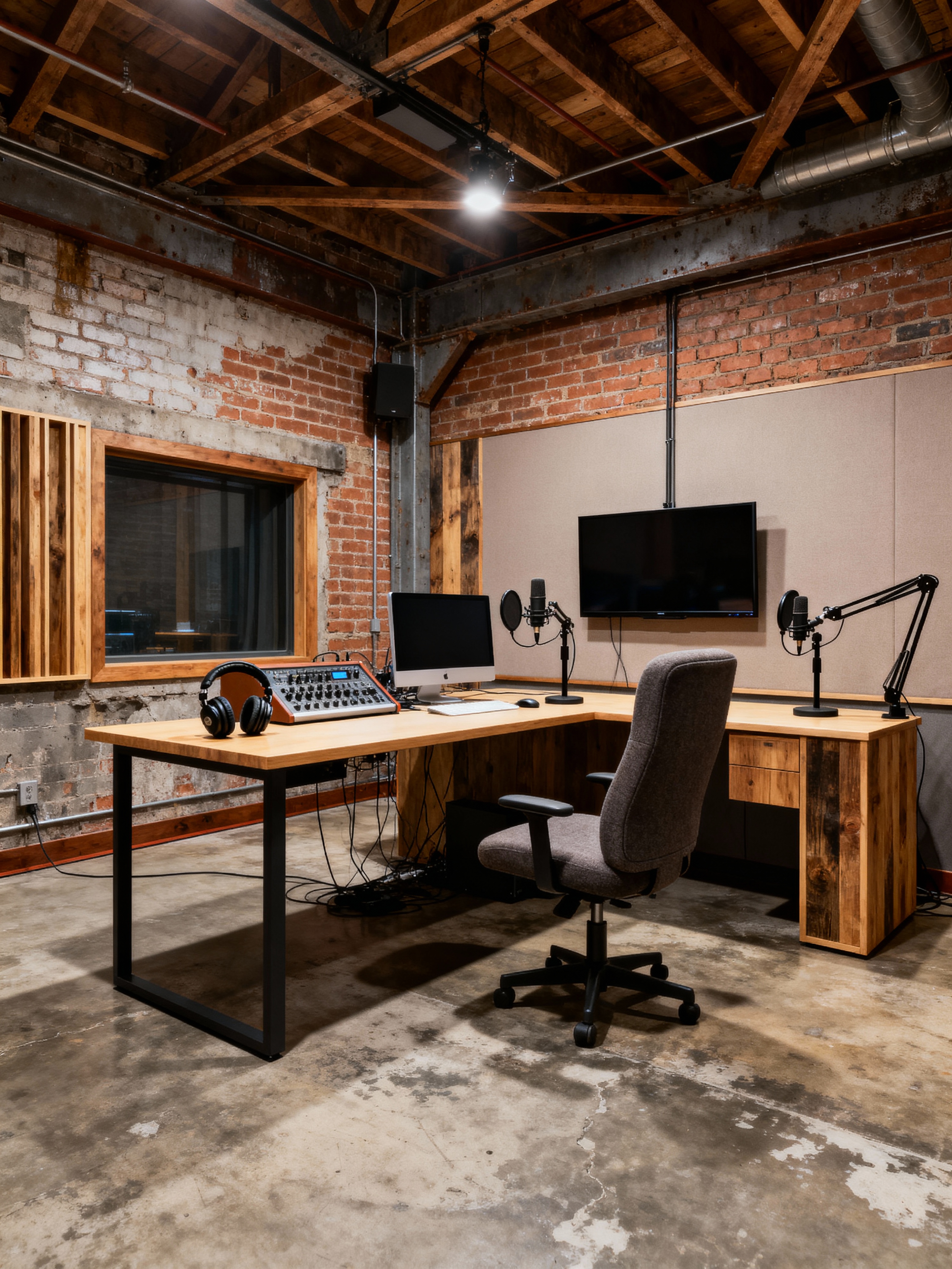 podcast studio with industrial style with headphones on table and radio station studio and talk show studio and computer and talk show interior and 2 microphone stands and comfortable podcast chair and wall mounted television. . with exposed brick and factory style and exposed concrete and utilitarian objects and reclaimed wood and raw aesthetic and open floorplan and exposed rafters