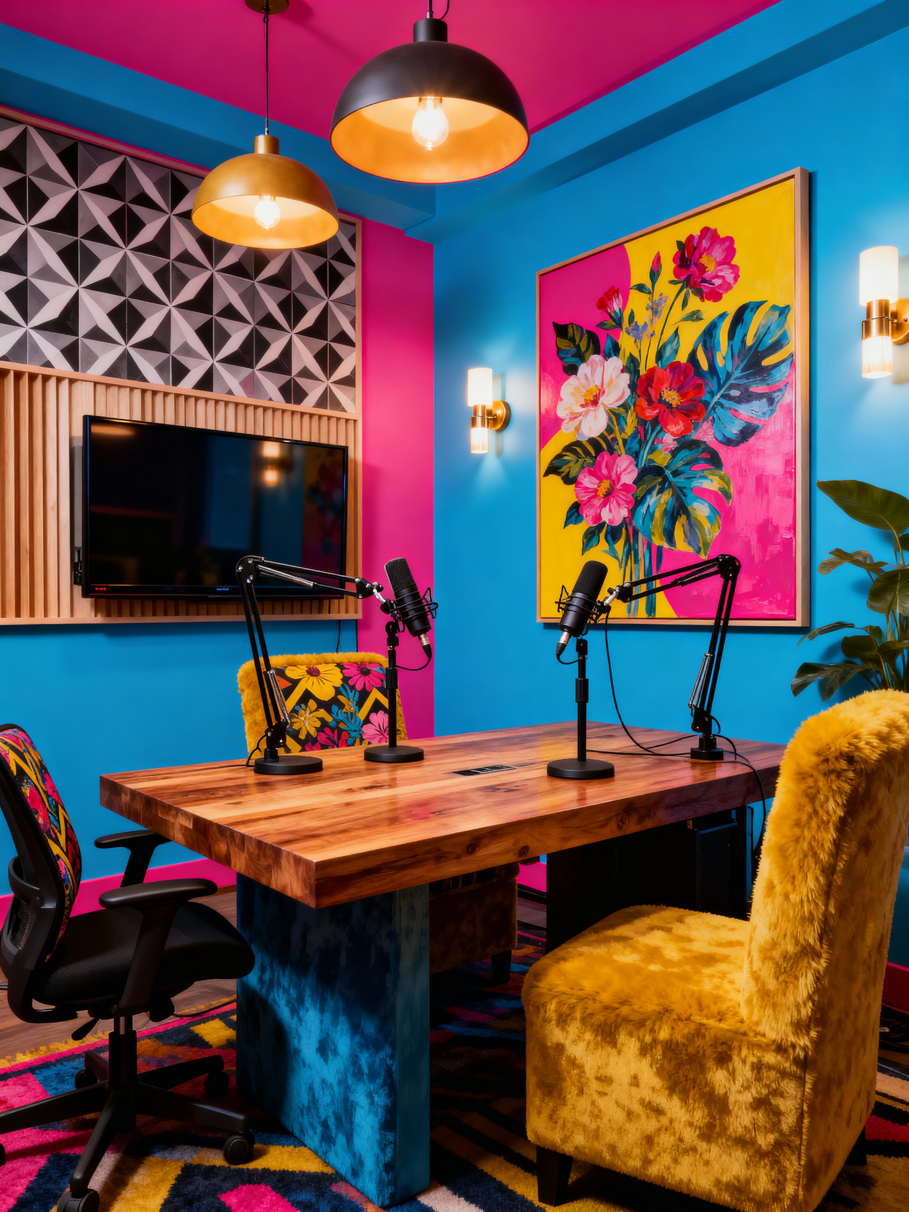 podcast studio with maximalist style with radio station studio and wall mounted television and talk show interior and sturdy desk and 2 microphone stands and talk show interior and talk show studio and soft lighting. . with playful and bold patterns and vibrant and bold creativity and bold colors and eye-catching and over-the-top aesthetic and bold design