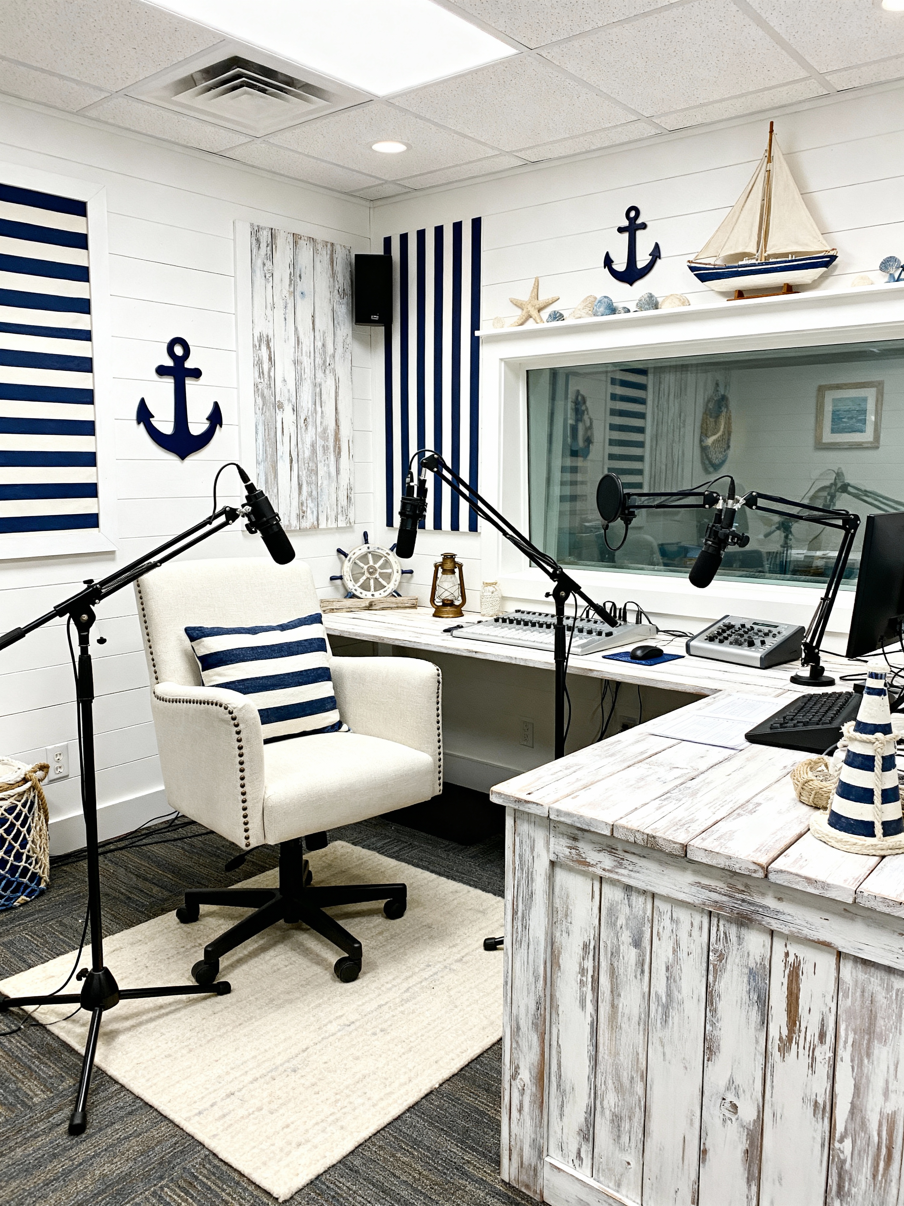 podcast studio with nautical style with radio station studio and 2 microphone stands and talk show studio and talk show studio and radio station studio and talk show studio and talk show interior and comfortable podcast chair. . with seaside charm and striped patterns and anchor motifs and sailboat elements and weathered wood and maritime decor and crisp white and coastal vibes