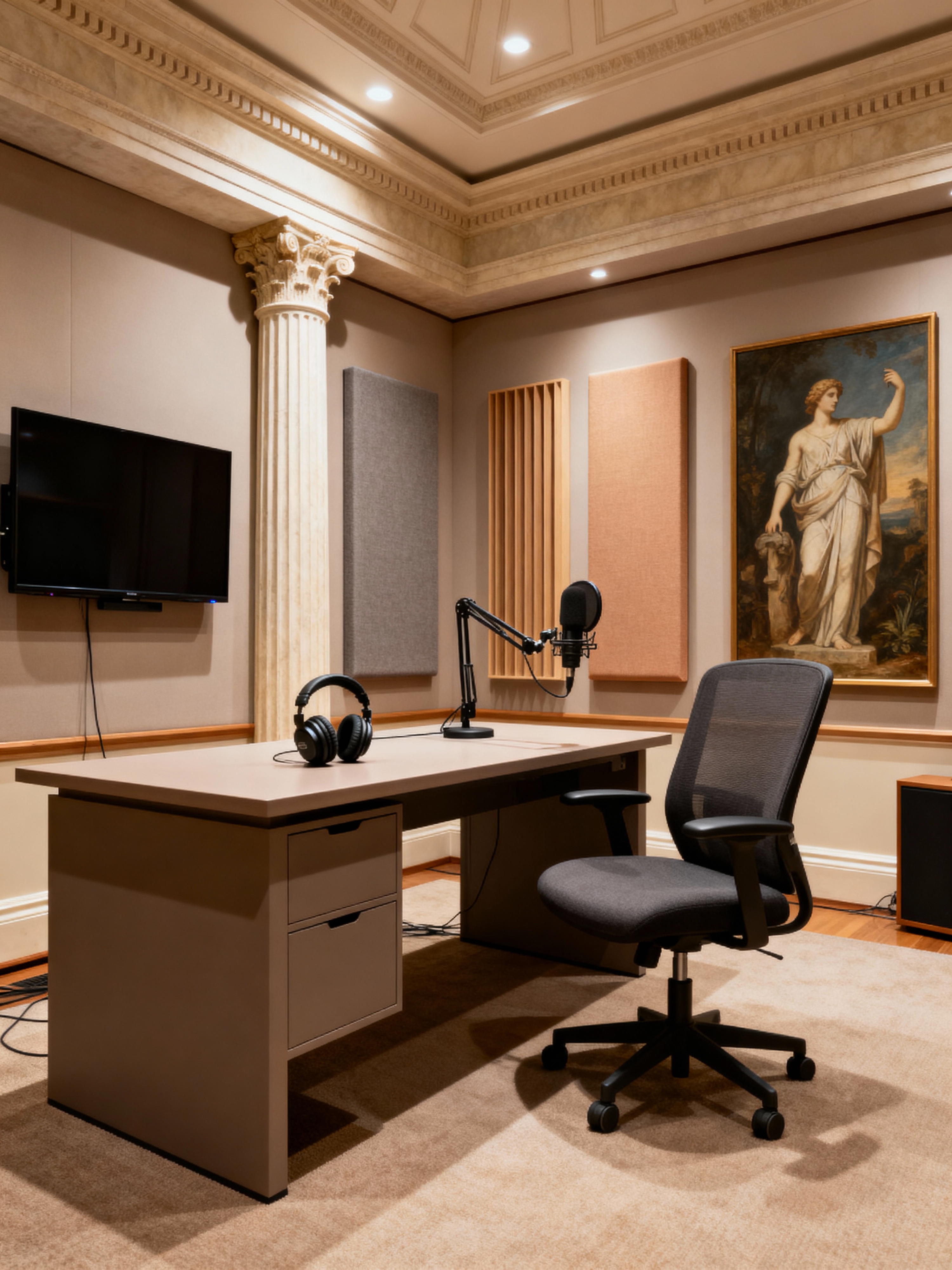 podcast studio with neoclassic style with soft lighting and headphones on table and radio station studio and wall mounted television and comfortable podcast chair and acoustic soundproofing panels for damping sound and radio show studio and sturdy desk. . with timeless artwork and thoughtful minimalism and timeless furniture and greek columns and classical architectural details and elegant and sophisticated and emphasized horizontal and vertical lines and high ceilings