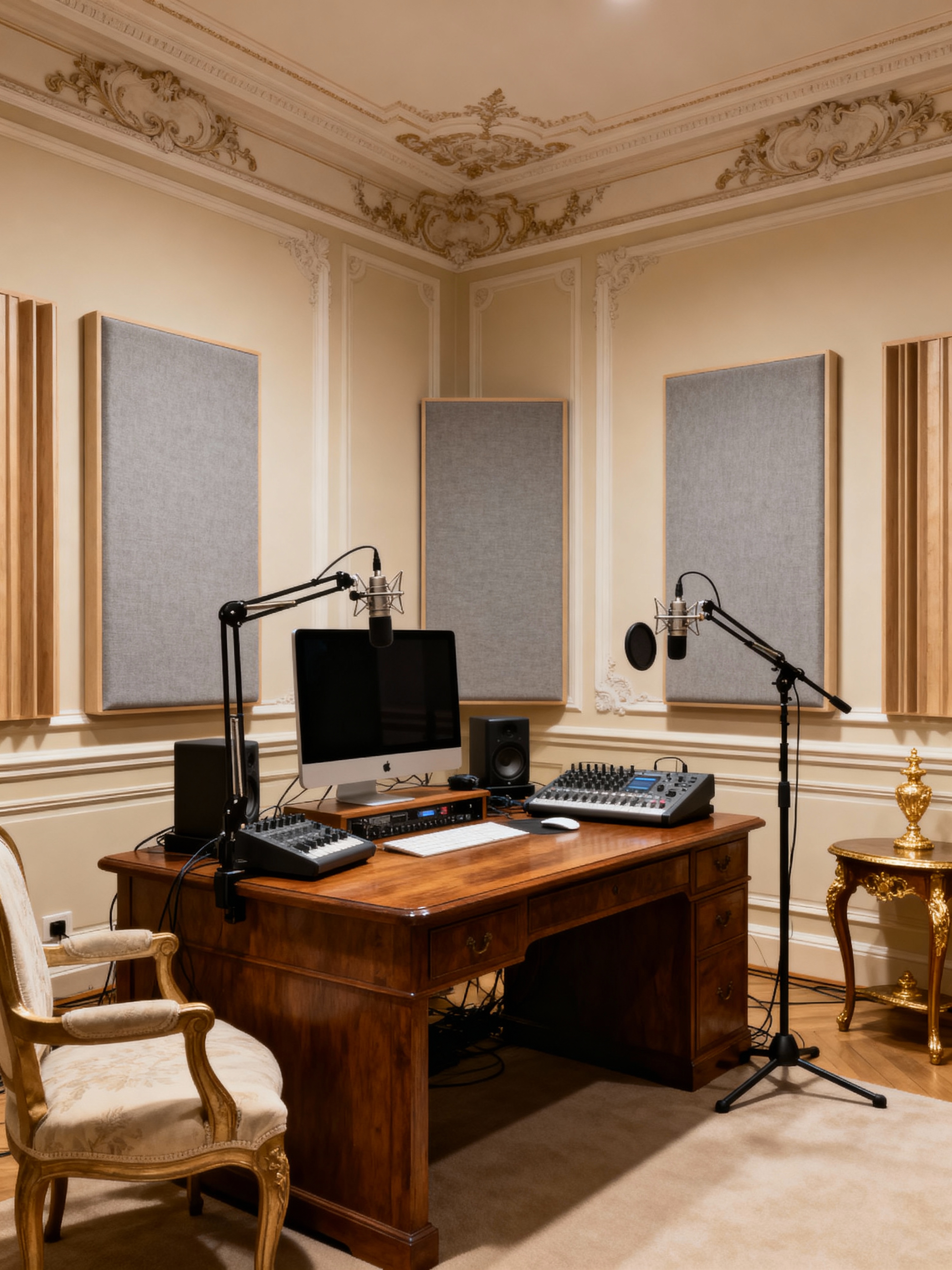 podcast studio with parisian style with computer and radio station studio and soft lighting and 2 microphone stands and talk show interior and radio station studio and acoustic soundproofing panels for damping sound and talk show studio. . with french elegance and refined style and sophisticated charm and neutral palette and european flair and ornate moldings and timeless beauty and antique furniture