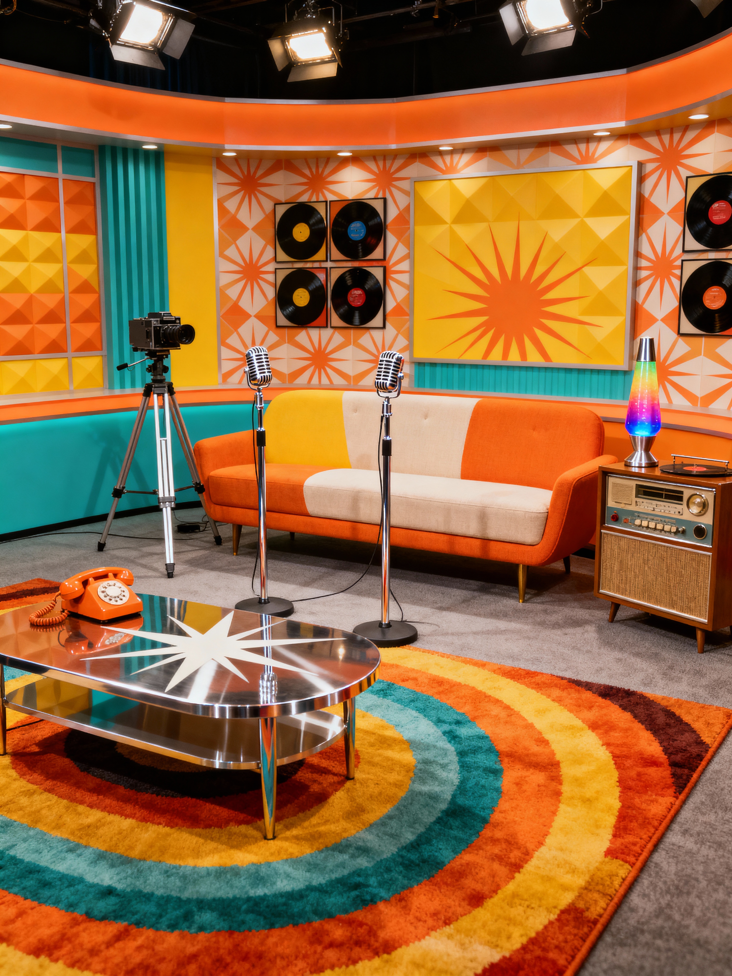 podcast studio with retro style with talk show studio and talk show interior and radio station studio and radio station studio and talk show studio and camera on tripod and 2 microphone stands and radio station studio. . with funky decor and nostalgic pieces and bold patterns and chrome accents and mod style and groovy vibes and vintage revival and bright colors