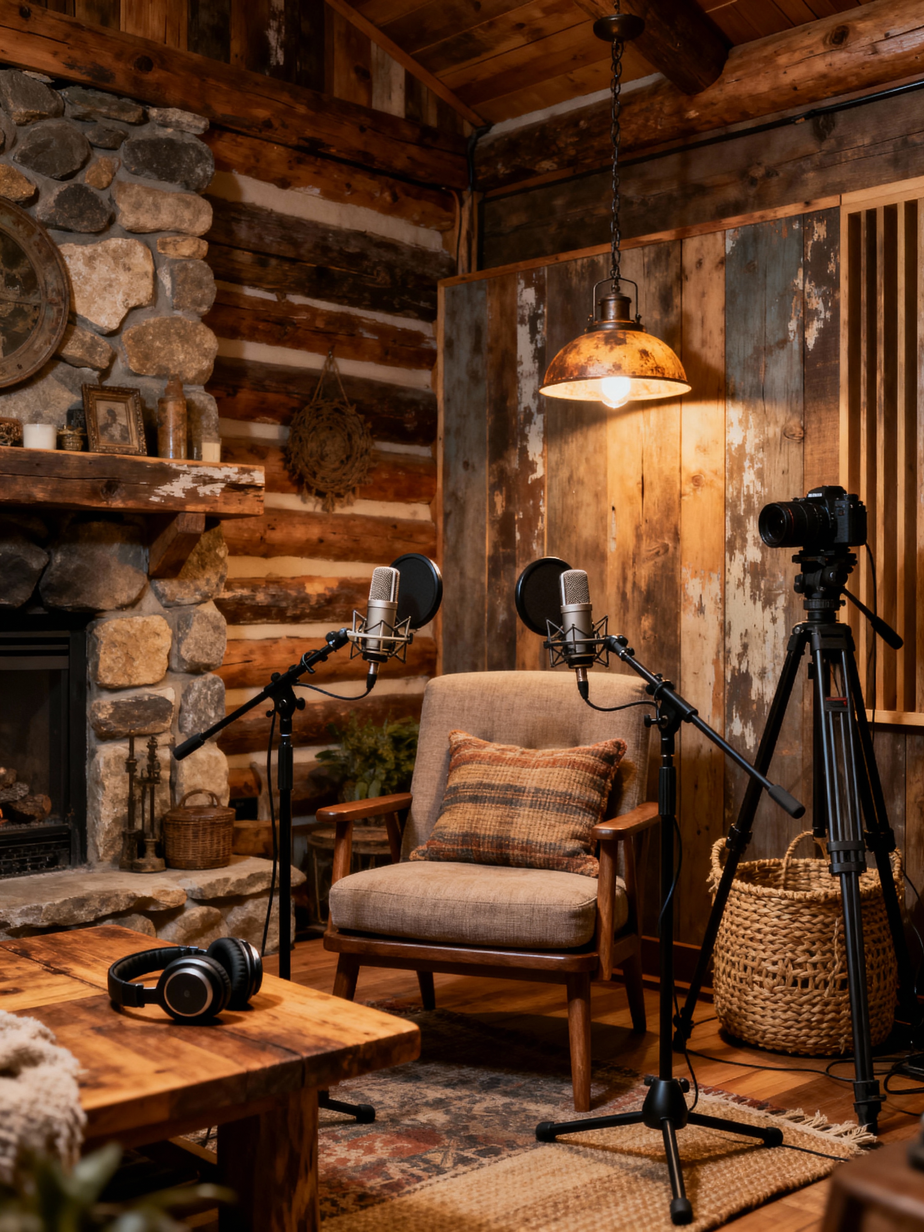 podcast studio with rustic style with headphones on table and talk show interior and camera on tripod and 2 microphone stands and comfortable podcast chair and soft lighting and talk show interior and talk show studio. . with cozy cabin and natural wood and stone accents and distressed finishes and earthy tones and warmth and woven textures and vintage decor