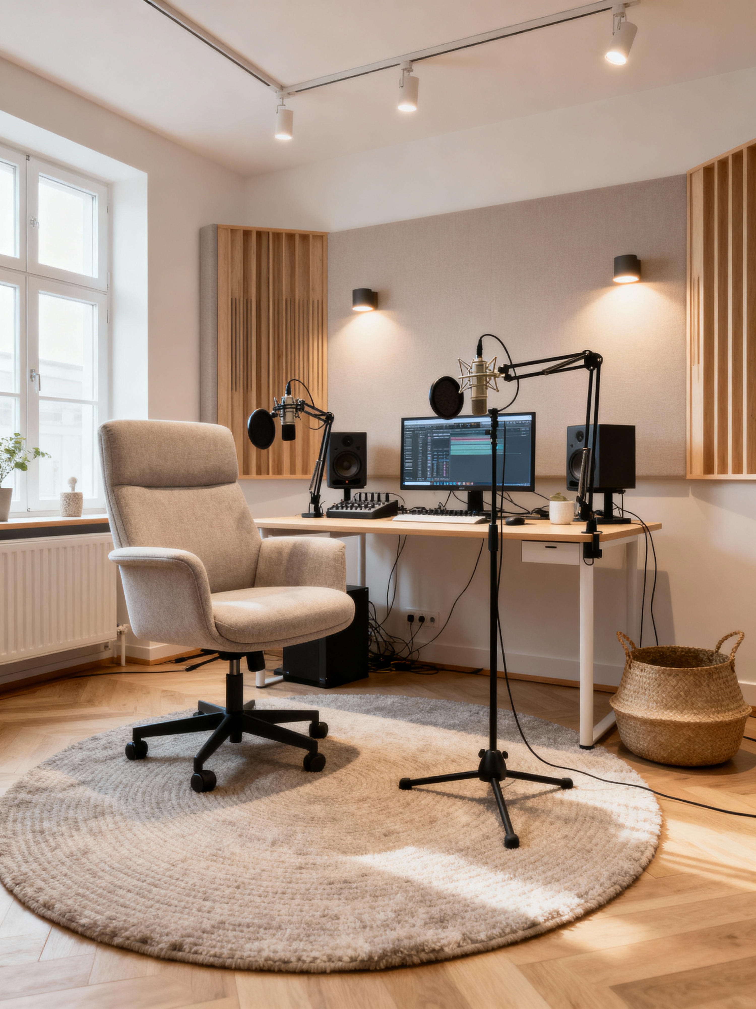 podcast studio with scandinavian style with talk show interior and talk show interior and comfortable podcast chair and talk show studio and talk show studio and radio station studio and soft lighting and computer. . with neutral palette and natural light and clean lines and hygge and functional furniture and cozy atmosphere and simple elegance and minimalist design