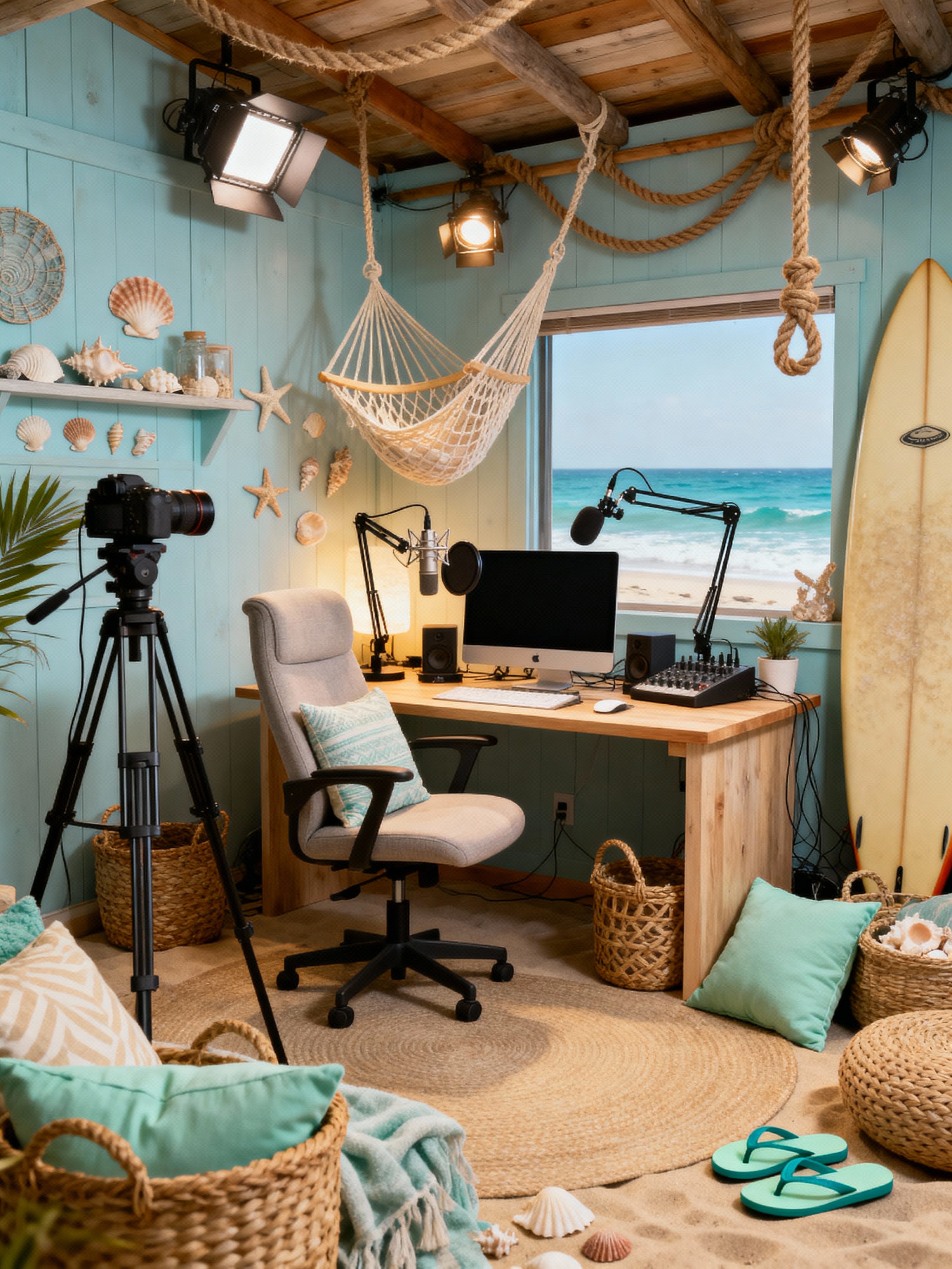 podcast studio with surf shack style with soft lighting and talk show studio and radio station studio and camera on tripod and comfortable podcast chair and computer and talk show interior and talk show interior. . with seashells and surfboard decor and woven baskets and beachy throw pillows and ocean-inspired colors and flip-flops and hammocks and rope details