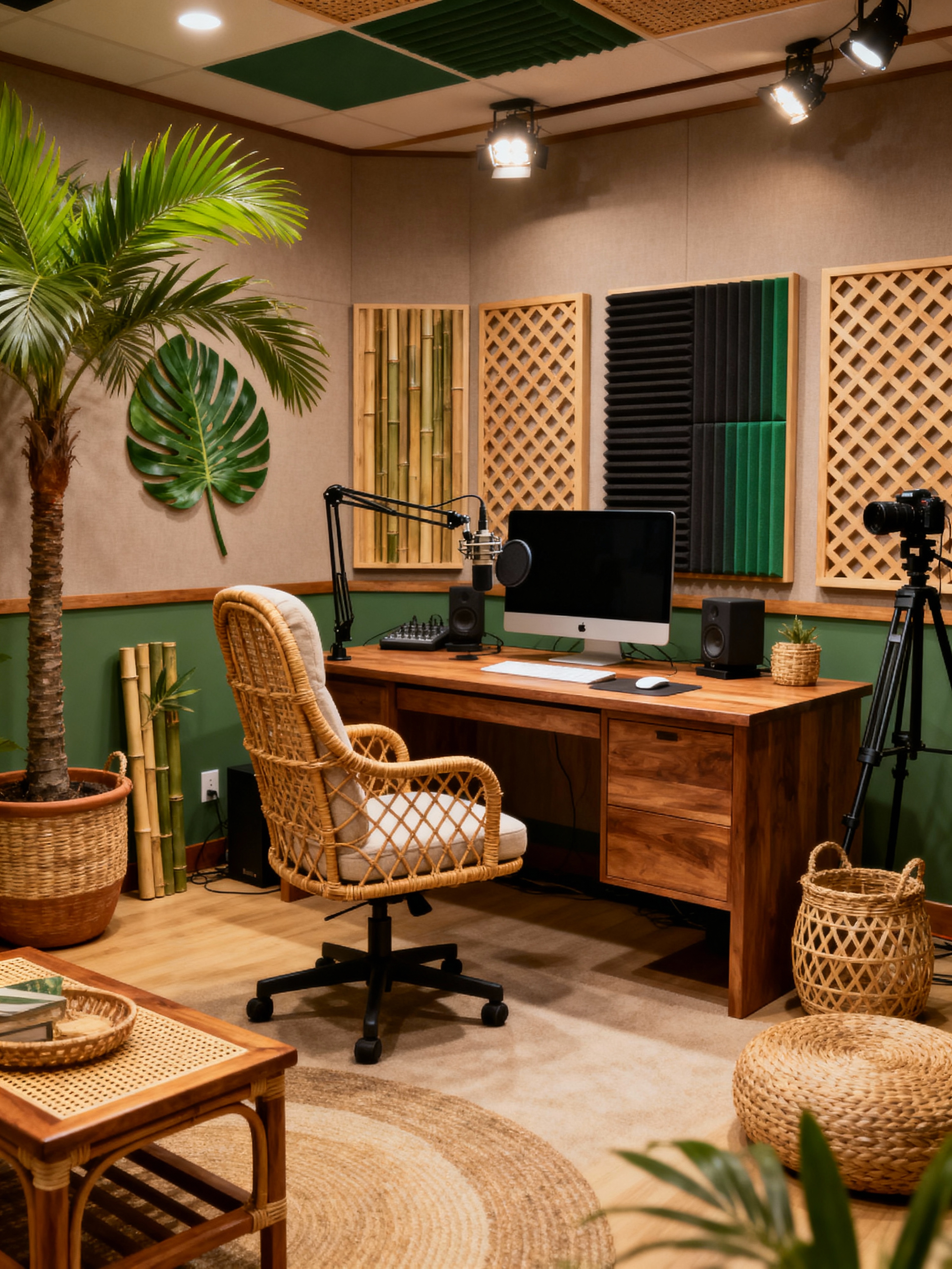podcast studio with tropical style with radio station studio and computer and comfortable podcast chair and acoustic soundproofing panels for damping sound and camera on tripod and soft lighting and radio show studio and talk show interior. . with palm trees and teak and cane motifs and wicker and palm leaves and lattice prints and bamboo and rattan