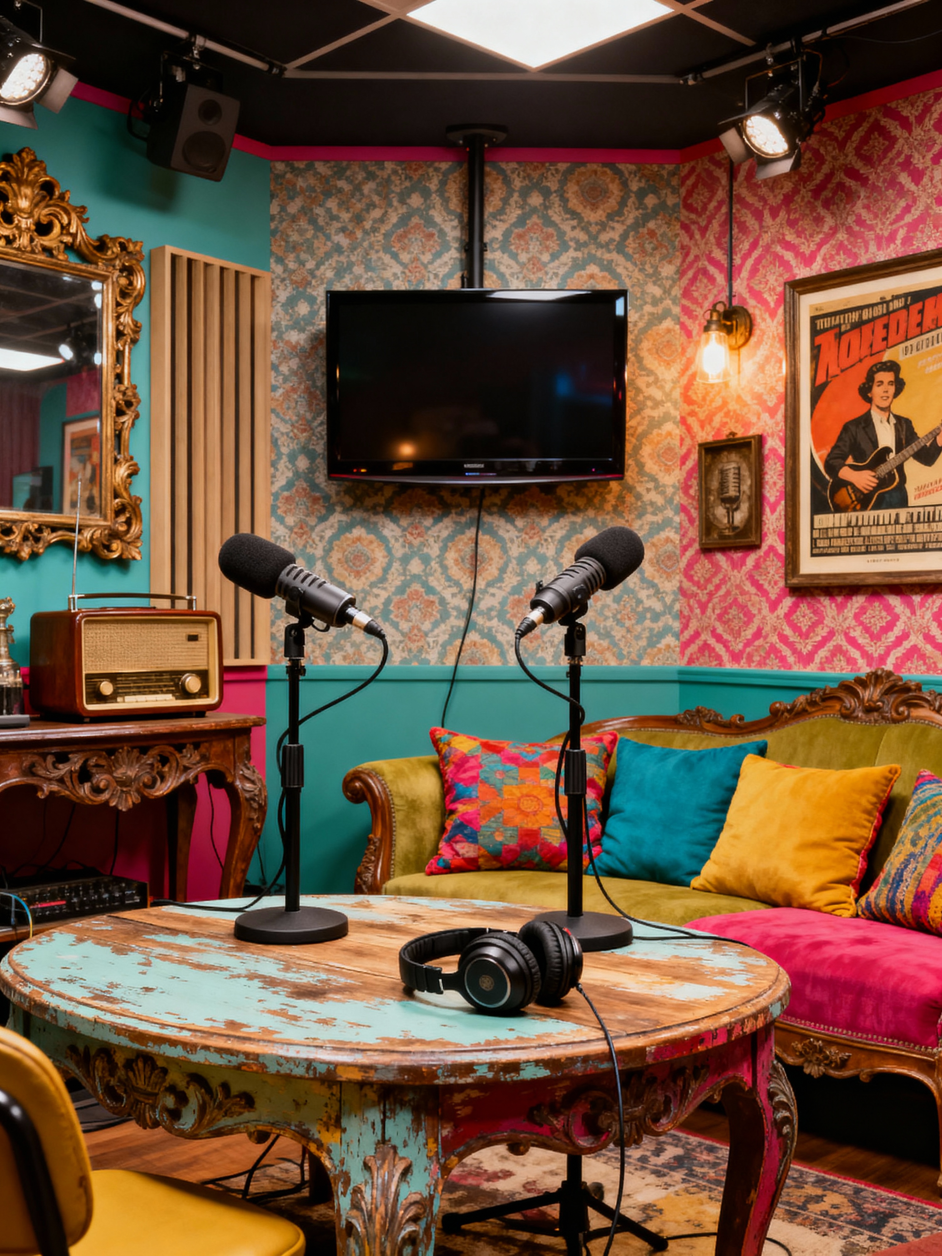 podcast studio with vintage style with talk show studio and talk show studio and talk show interior and 2 microphone stands and talk show interior and headphones on table and radio show studio and wall mounted television. . with nostalgic feel and shabby chic and colorful accents and antique decor and eclectic and ornate details and mid-century and bold patterns