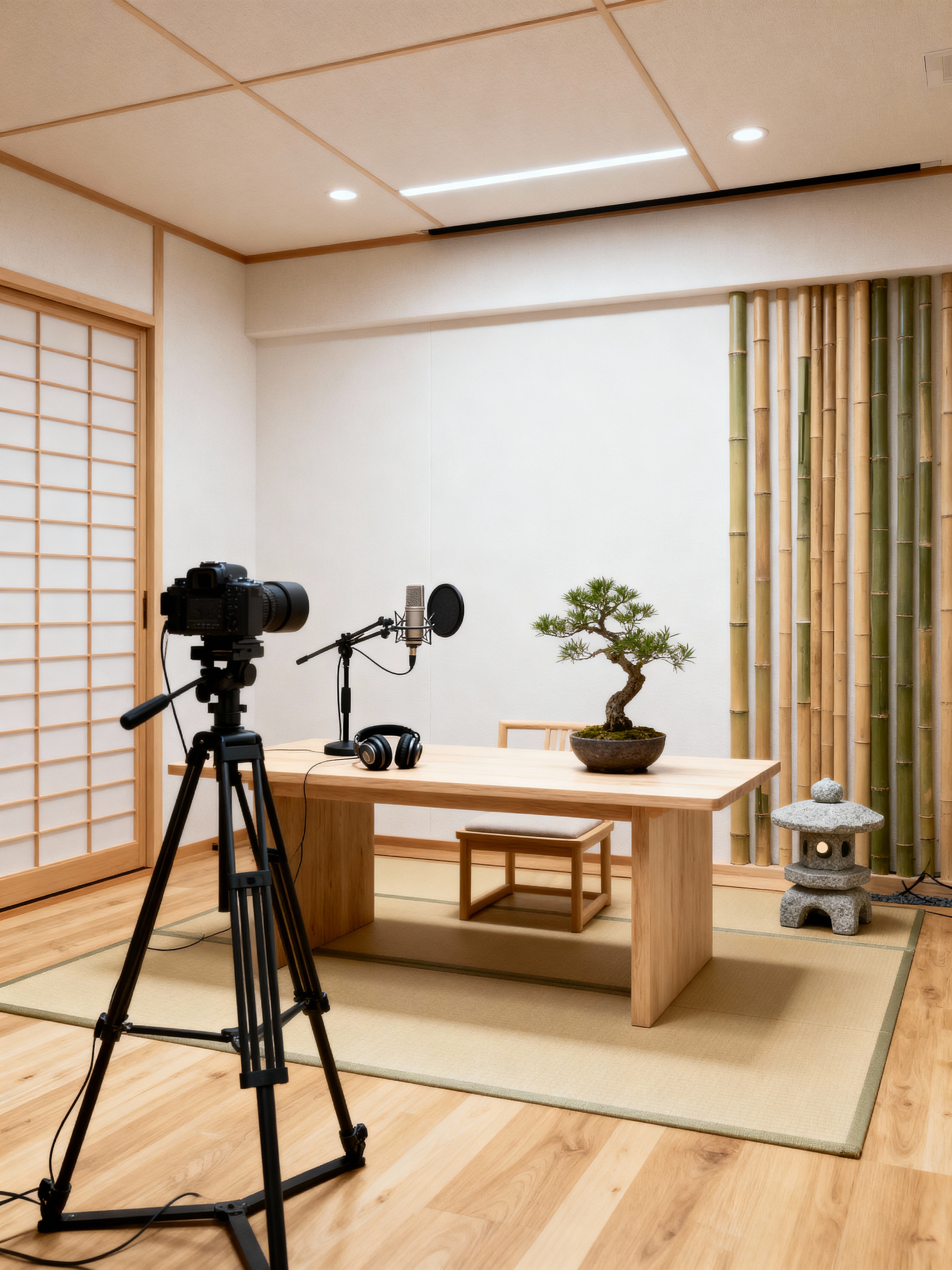 podcast studio with zen style with talk show interior and radio show studio and talk show interior and talk show studio and camera on tripod and talk show interior and headphones on table and soft lighting. . with simplicity and asian zen interior and mimimalist and asian zen interior and japanese minimalist interior and clean lines and clutter free and serenity and harmony