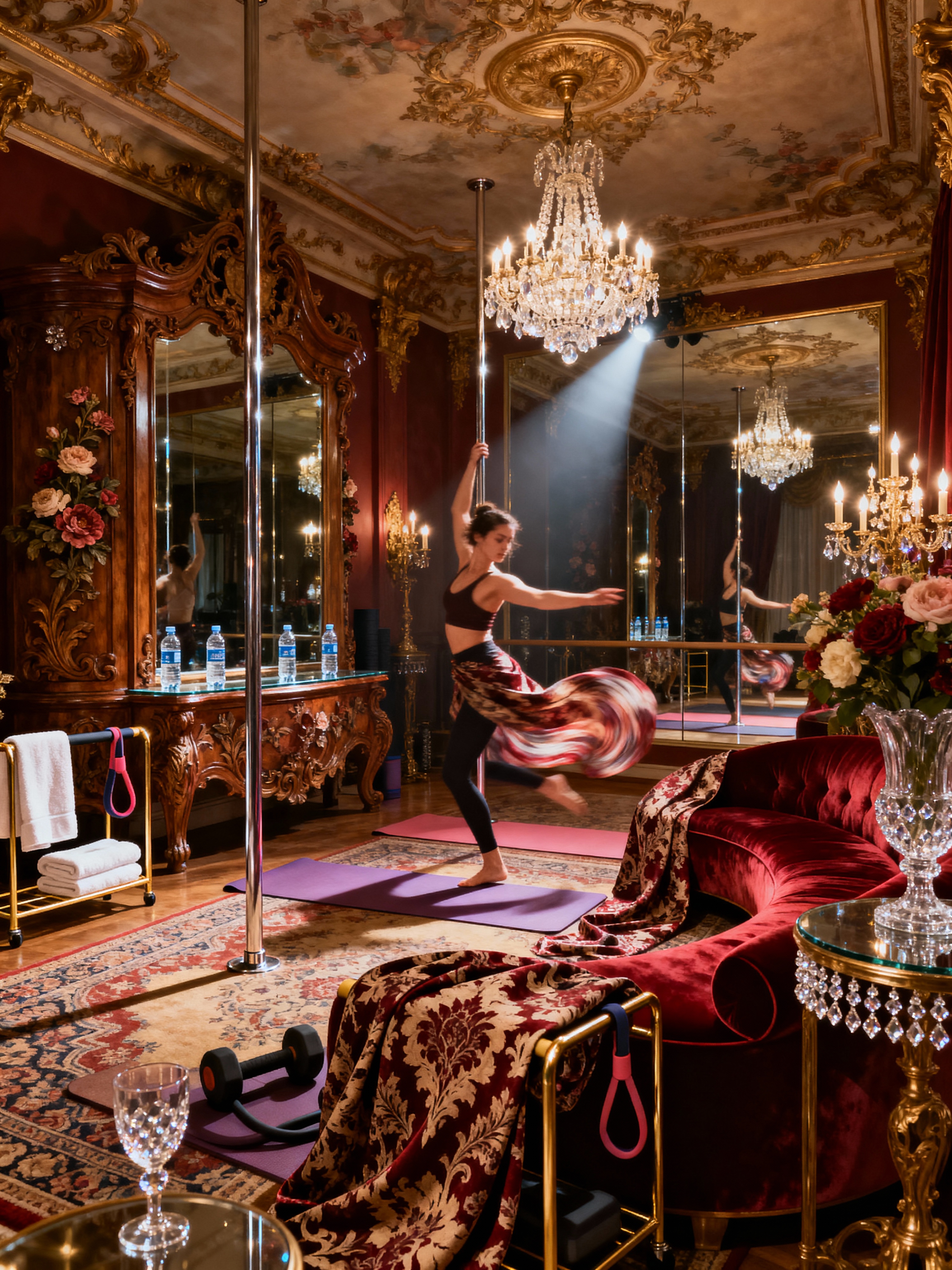 pole dance studio with baroque style with sound system and dim lighting and yoga mats and exercise equipment and water bottles and grip aids and towels and dance poles. . with movement and drama and crystal and glass accents and opulent and colossal furniture and elaborate ornamentation and intricate carvings and ornaments and sensuous richness and luxurious floral and damask fabrics