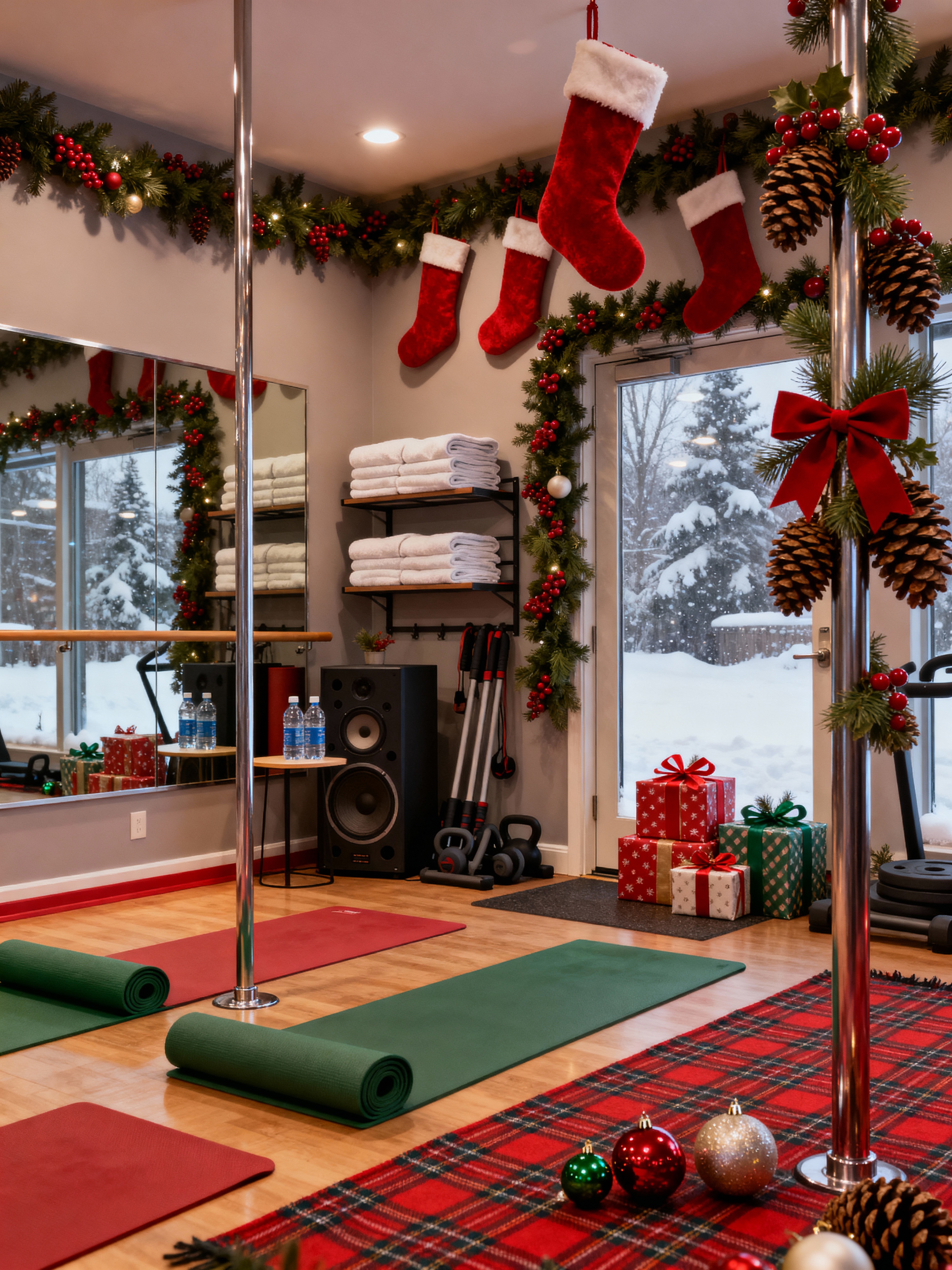 pole dance studio with christmas style with dim lighting and towels and mirrors and yoga mats and sound system and water bottles and exercise equipment and grip aids. . with berries and greenery draped and snow outside and giftwrapped gifts and ribbons and a few big socks hanging and tie pinecones and berries and christmas ornaments and plaid rugs