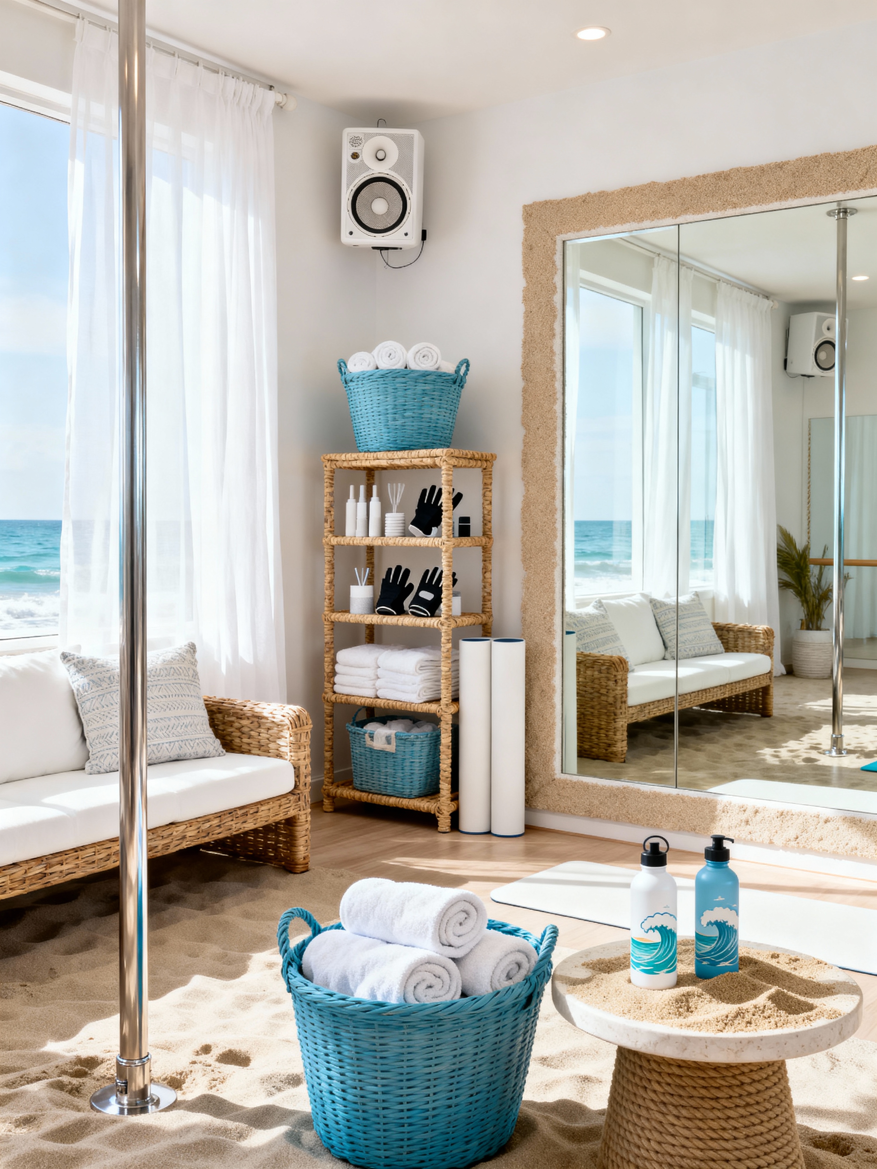 pole dance studio with coastal style with comfortable seating and mirrors and towels and exercise equipment and sound system and dim lighting and grip aids and water bottles. . with ocean-inspired and airy feel and nautical decor and natural materials and white decor and sand tones and beach vibes and wicker furniture