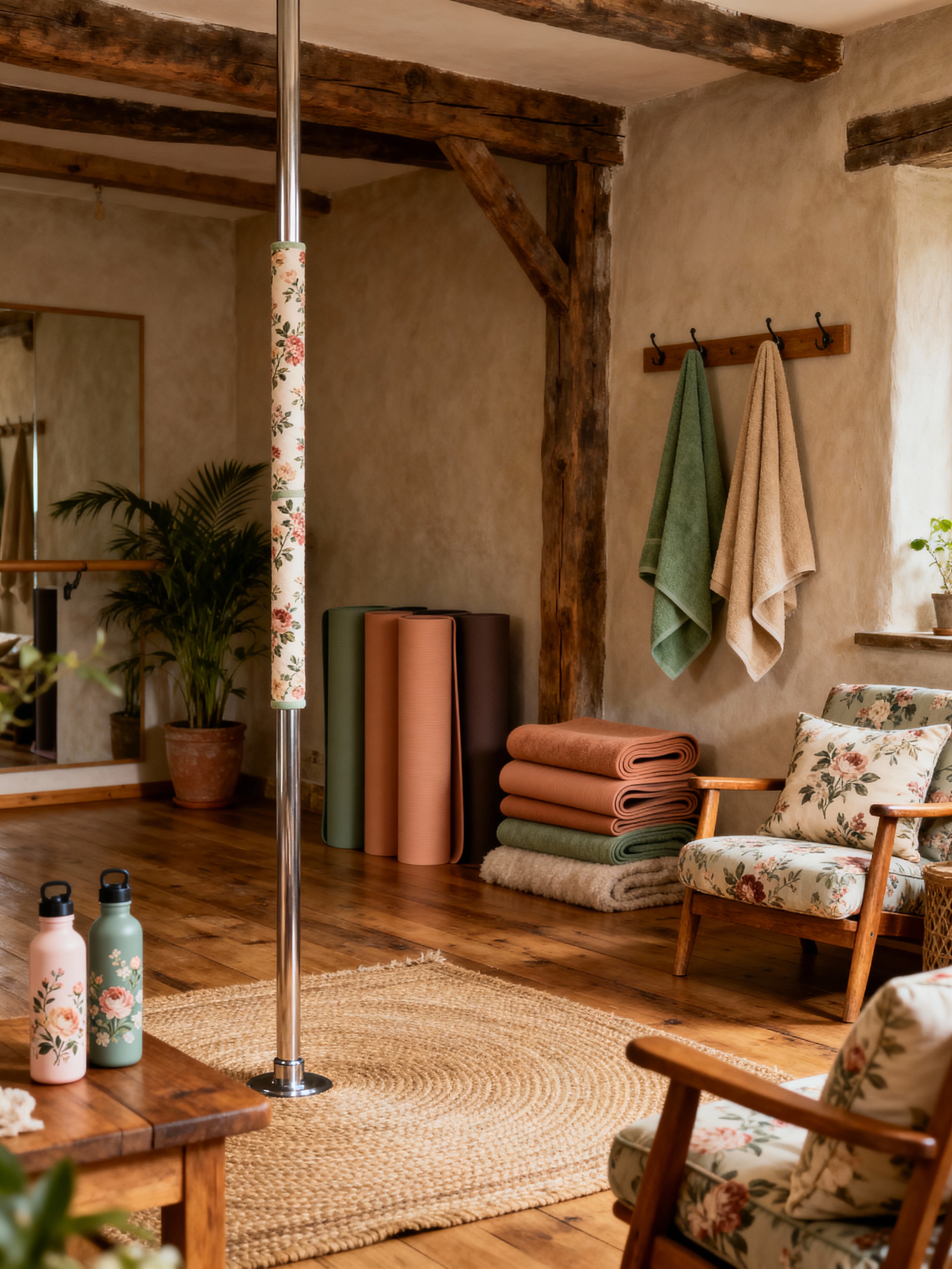 pole dance studio with cottagecore style with exercise equipment and water bottles and yoga mats and grip aids and dim lighting and towels and dance poles and comfortable seating. . with cottage style and rustic and earthy and floral patterns and natural and muted colors and traditional and country style