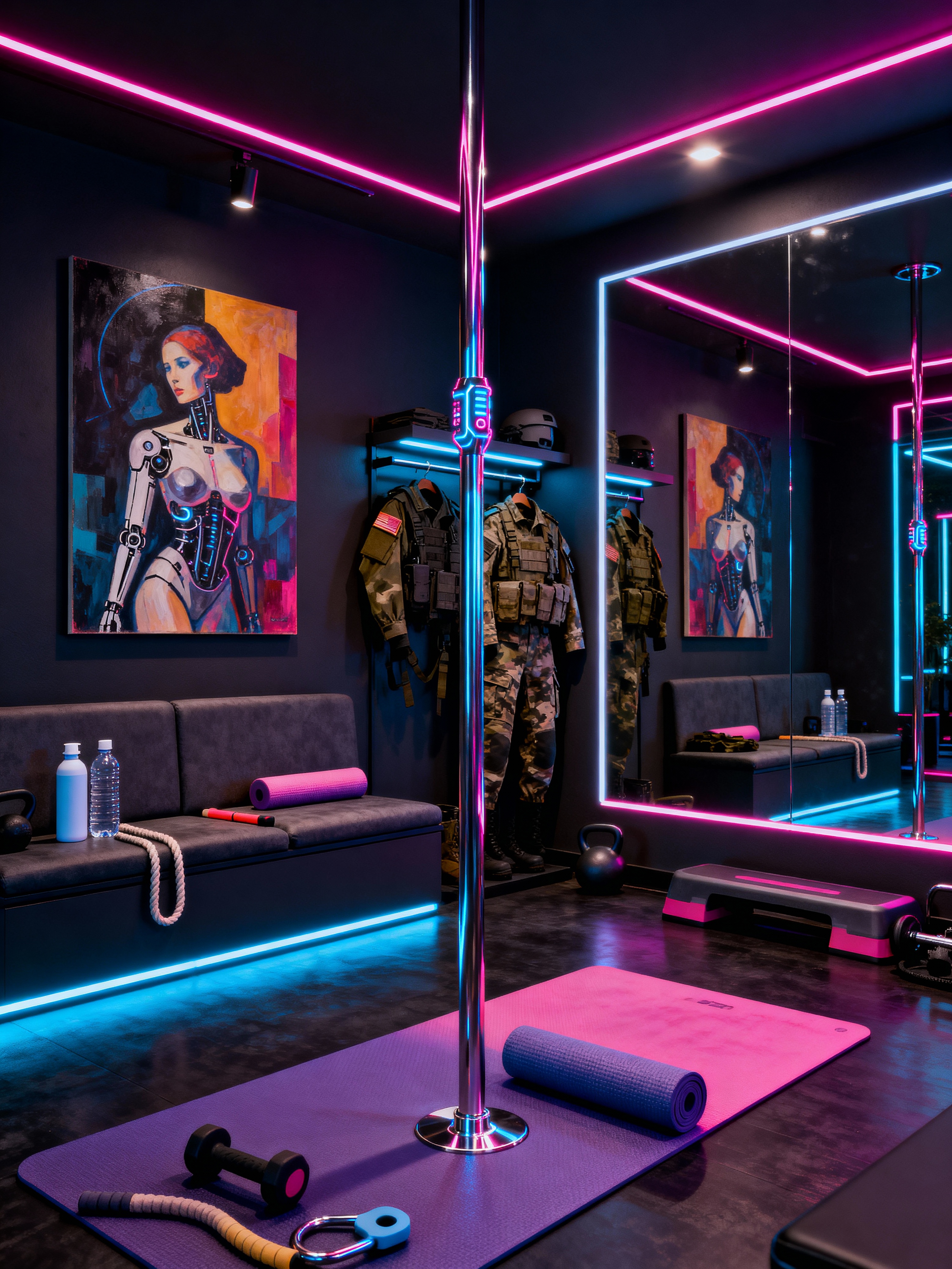 pole dance studio with cyberpunk style with water bottles and comfortable seating and grip aids and dance poles and dim lighting and yoga mats and exercise equipment and mirrors. . with military uniforms and gear and synthwave and futuristic cybernetic details and dark night and surrealist paintings and cyberpunk lights and minimalist and bladerunner lights