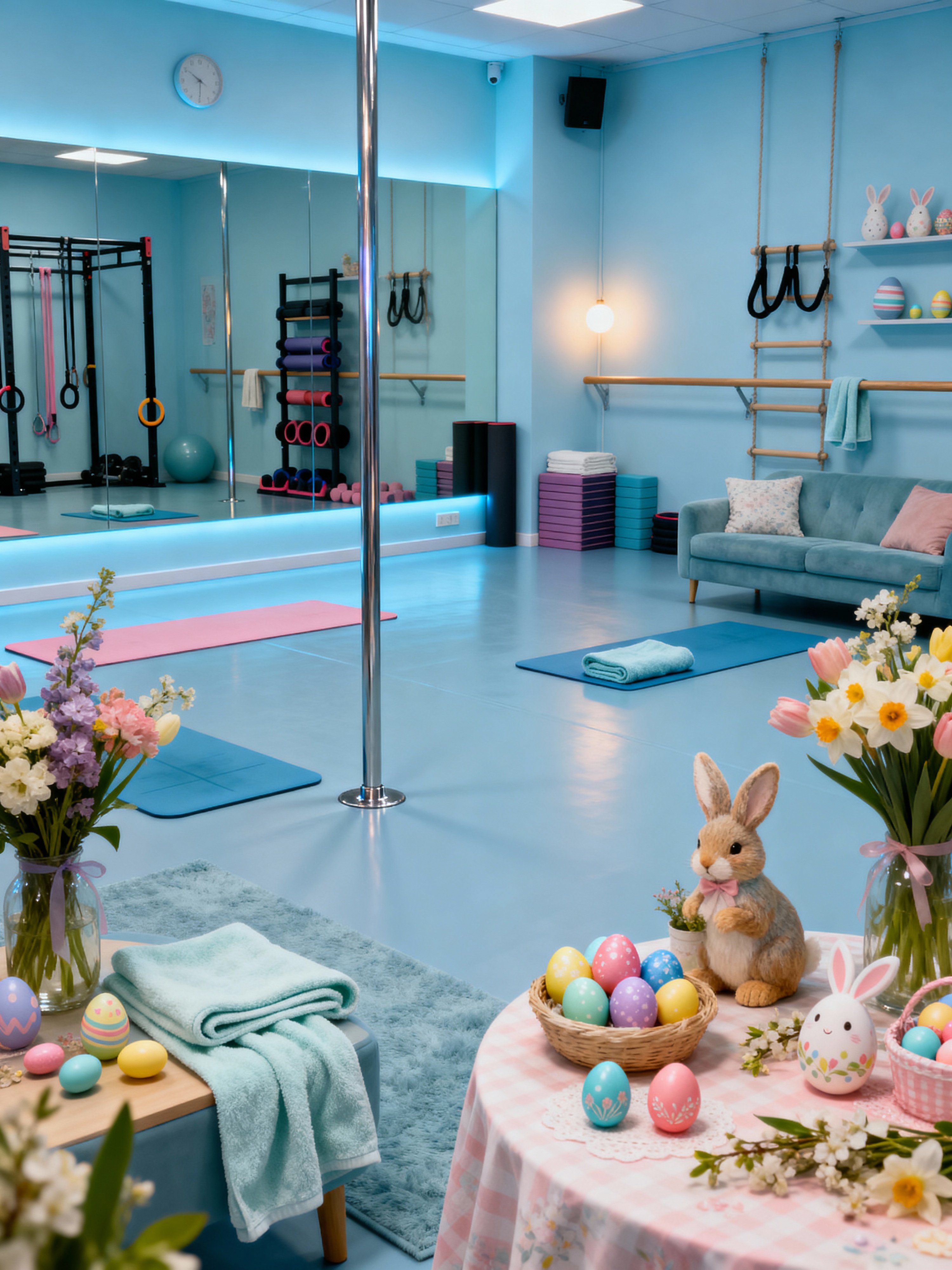 pole dance studio with easter style with exercise equipment and yoga mats and grip aids and dim lighting and dance poles and towels and comfortable seating and mirrors. . with flowers on table and light blue colors and colorful easter eggs and easter decorations and spring decorations and flowers on table