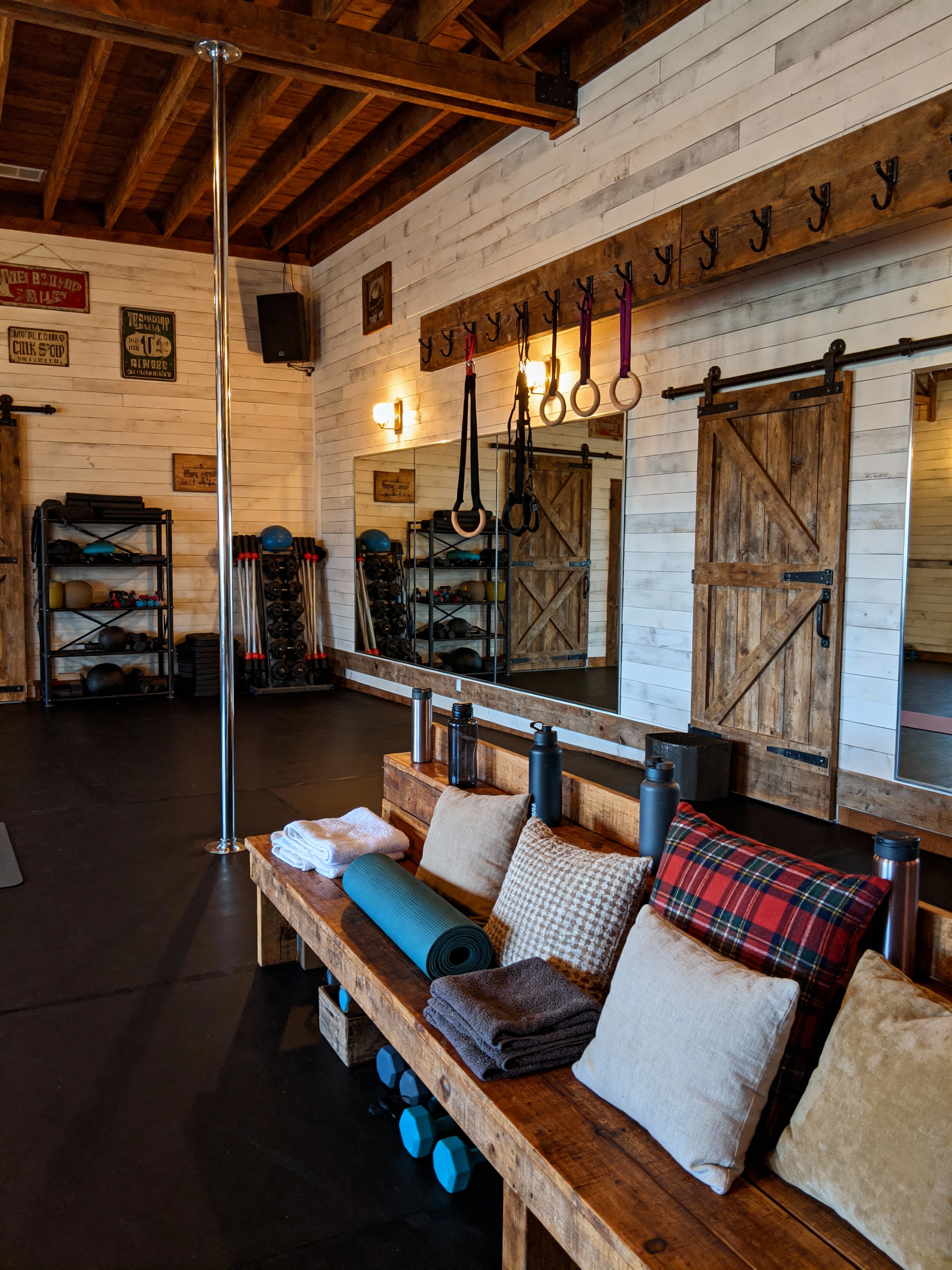 pole dance studio with farmhouse style with water bottles and yoga mats and towels and mirrors and comfortable seating and grip aids and dim lighting and exercise equipment. . with exposed wood and barn doors and country style and shiplap walls and natural textures and rustic charm and industrial accents and vintage decor