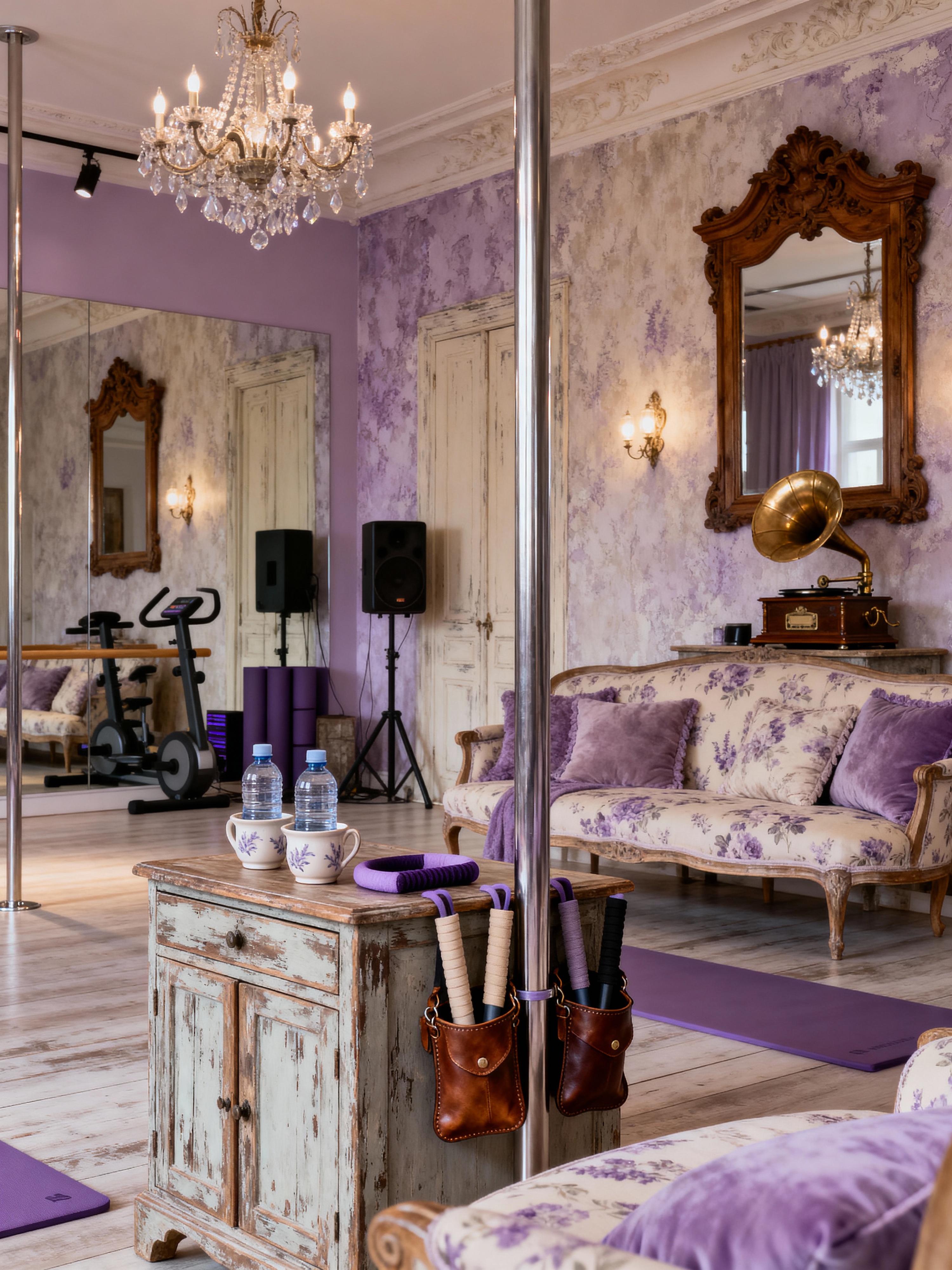 pole dance studio with french country style with dance poles and exercise equipment and comfortable seating and water bottles and sound system and grip aids and dim lighting and mirrors. . with ornate details and elegant rustic and chandeliers and lavender accents and vintage furniture and distressed wood and textured walls and country elegance