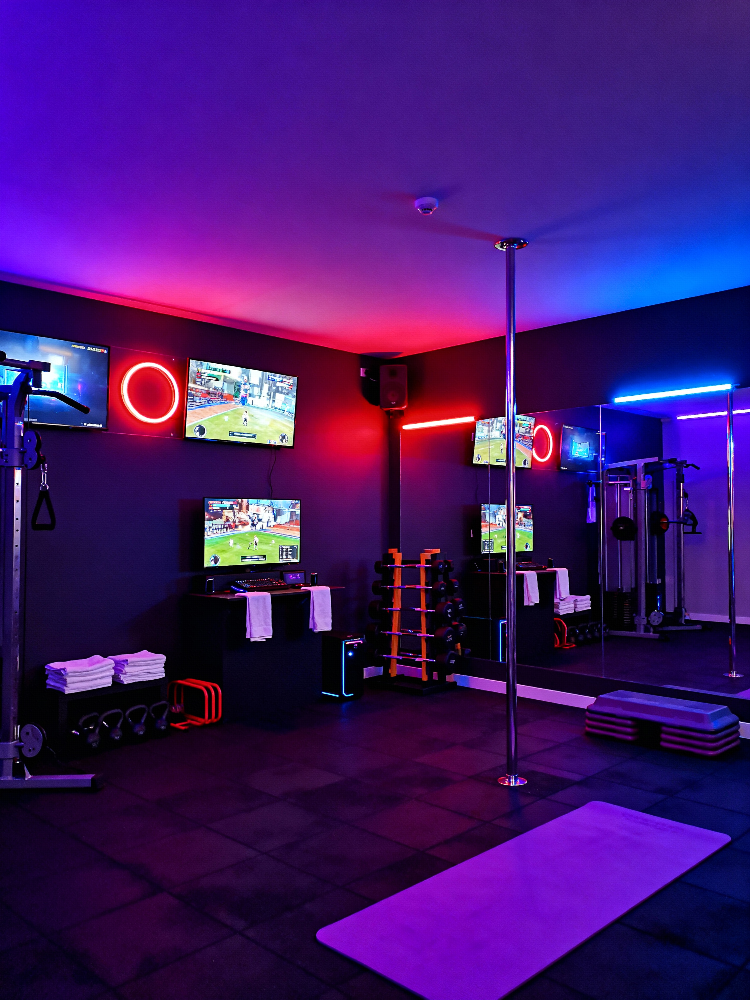 pole dance studio with gaming room style with exercise equipment and yoga mats and dim lighting and mirrors and towels and dance poles and grip aids and sound system. . with dark lit room and neon lights and multiple displays and video game consoles and at night and purple and red lights and dark room and purple, red and blue fade light