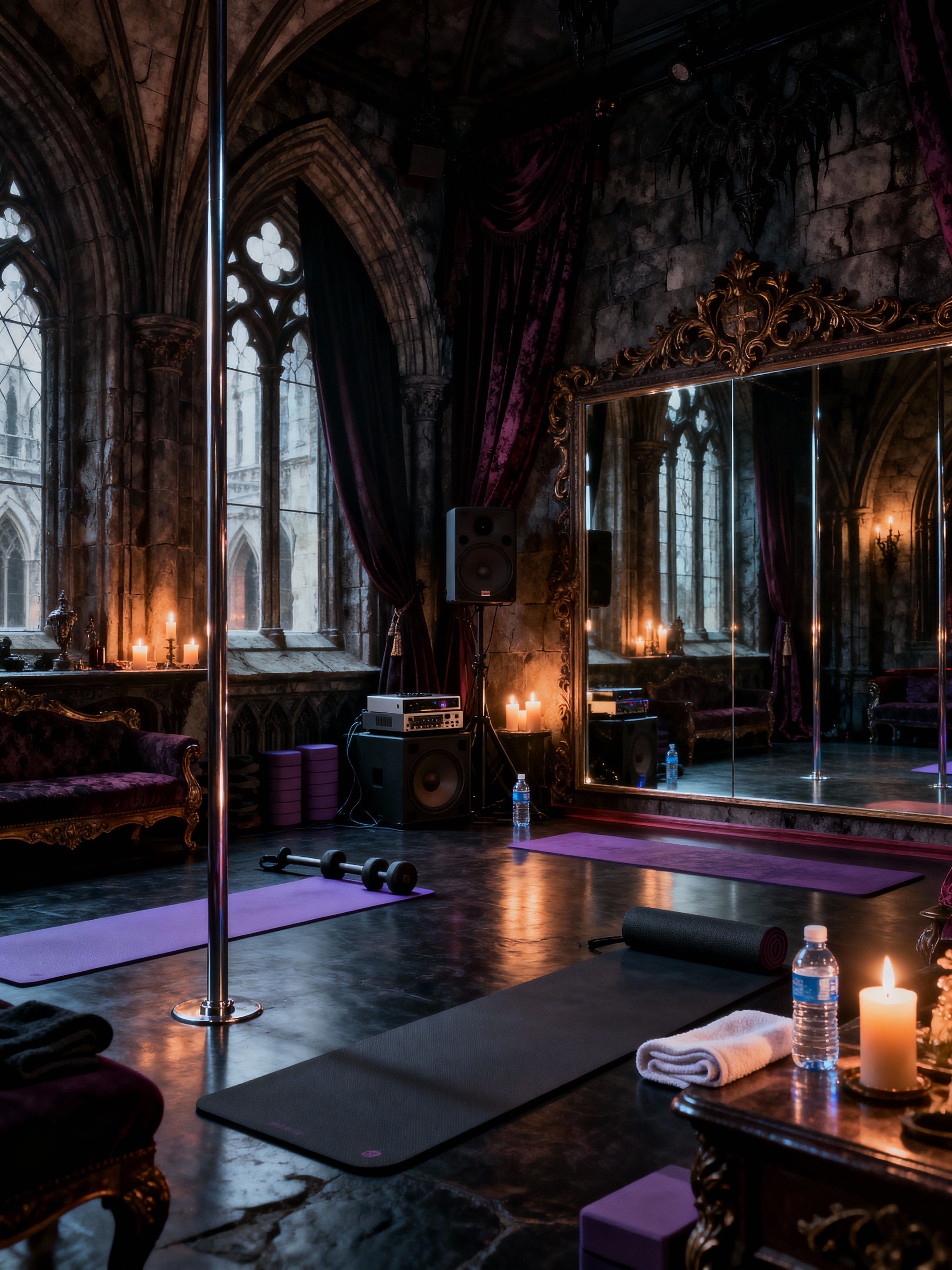 pole dance studio with gothic style with dim lighting and mirrors and dance poles and exercise equipment and yoga mats and water bottles and sound system and towels. . with rich fabrics and ornate details and heavy furniture and mysterious mood and arched windows and stone textures and candlelit ambiance and cathedral style