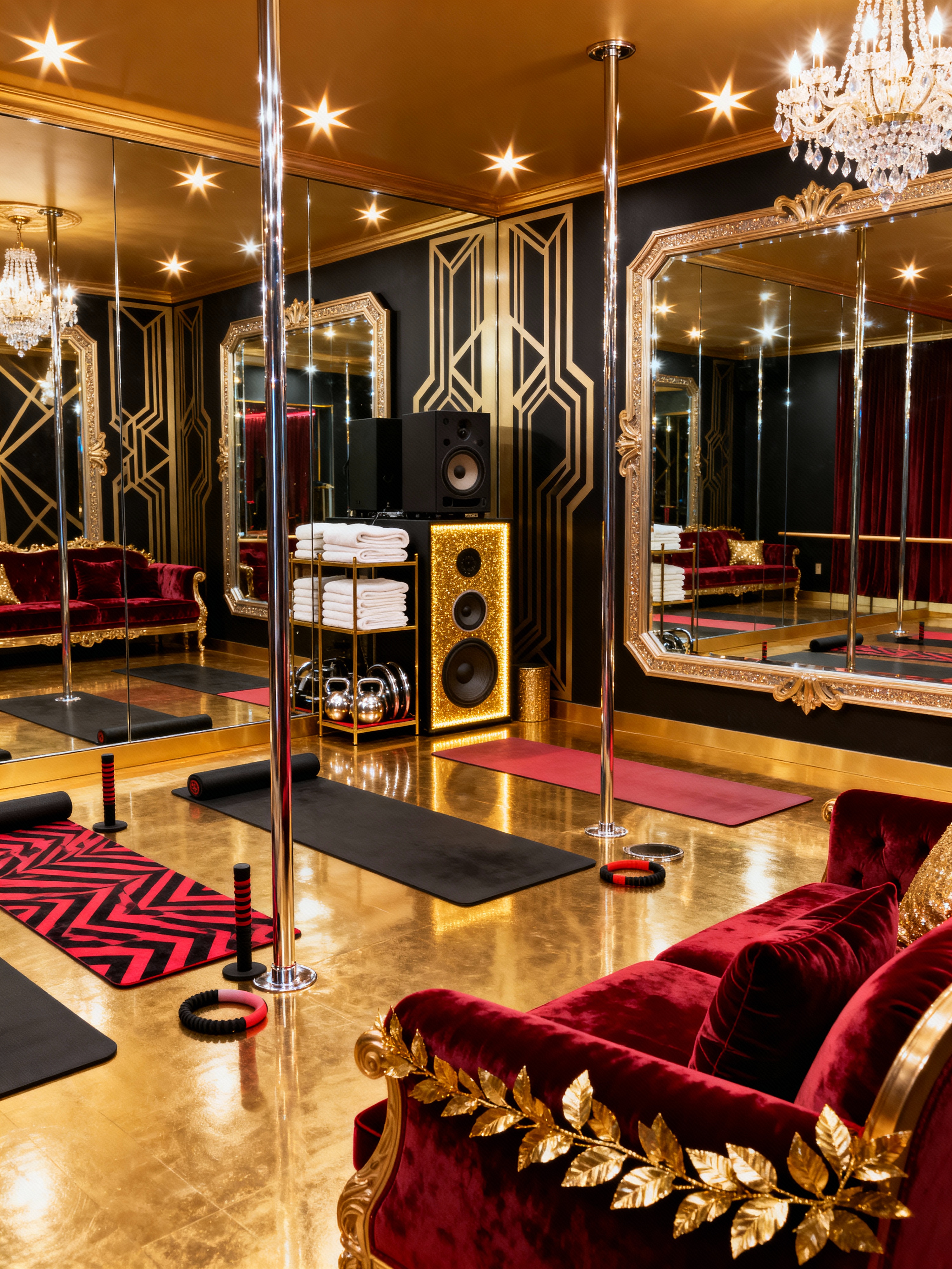 pole dance studio with hollywood glam style with dance poles and yoga mats and grip aids and exercise equipment and towels and sound system and mirrors and comfortable seating. . with star quality and bold colors and glamorous style and metallic accents and mirrored surfaces and velvet upholstery and opulent details and art deco influence