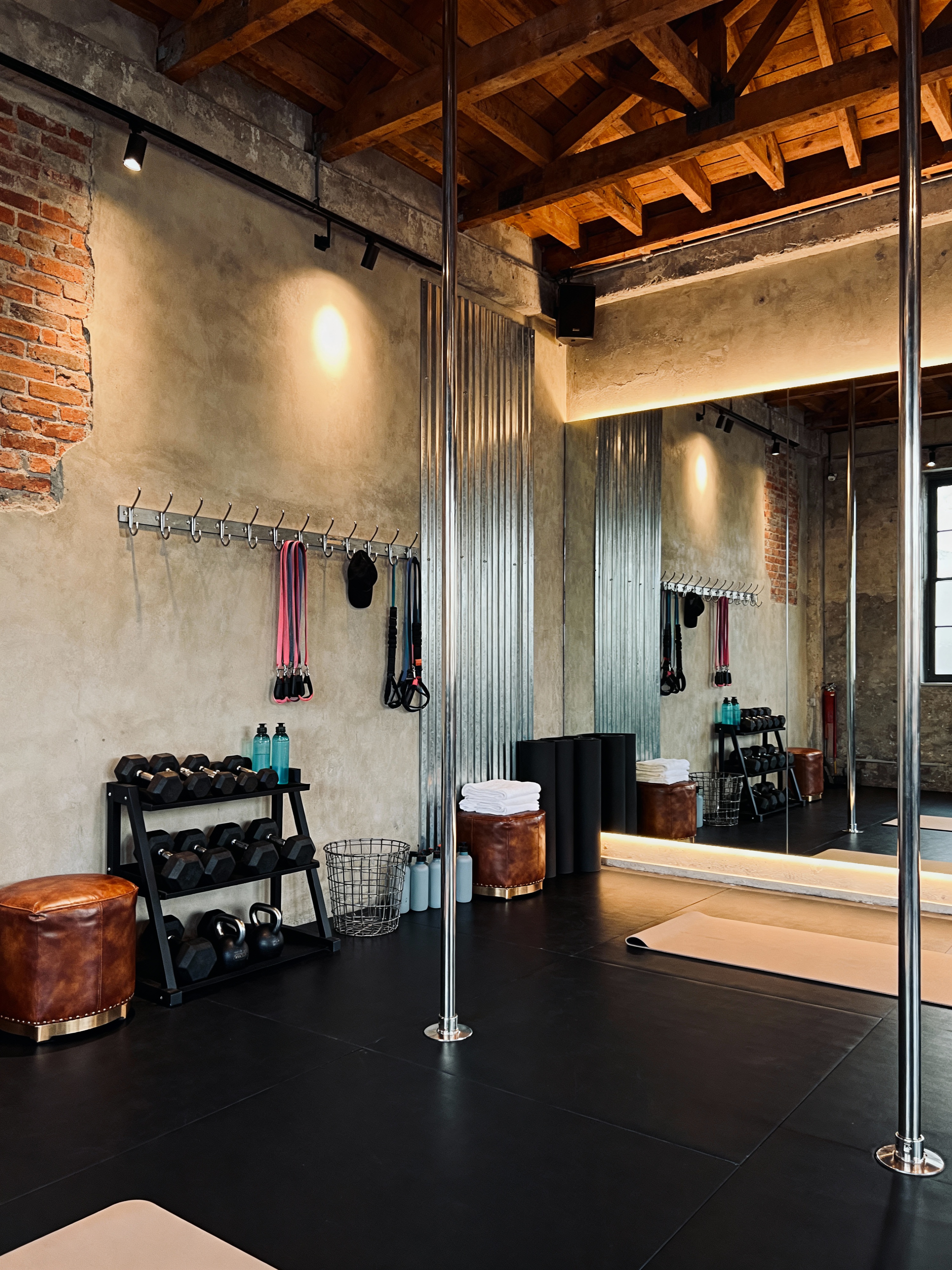 pole dance studio with industrial style with exercise equipment and water bottles and mirrors and dim lighting and comfortable seating and towels and yoga mats and dance poles. . with exposed concrete and raw aesthetic and exposed brick and neutral tones and exposed rafters and utilitarian objects and open floorplan and metal panels