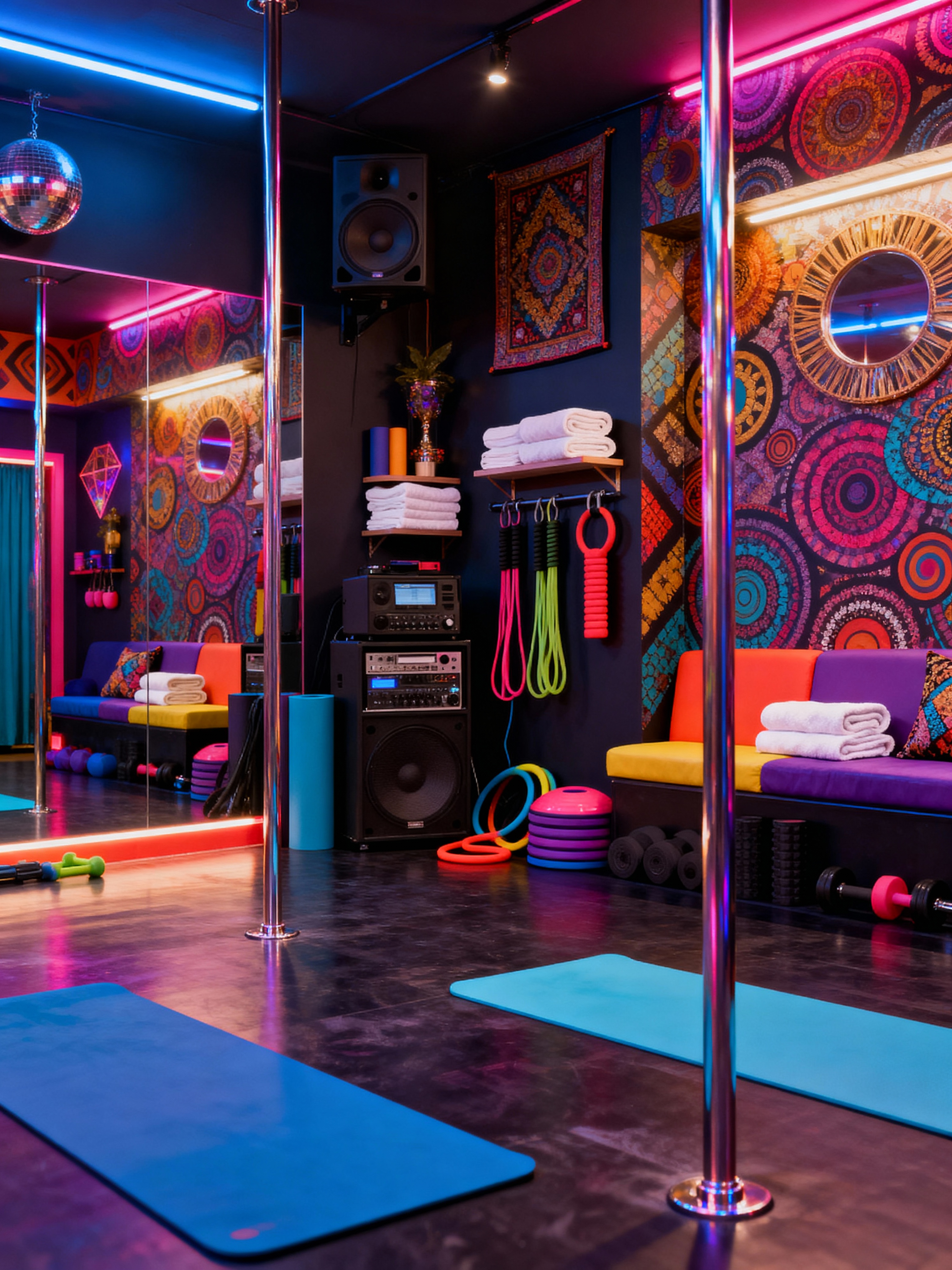 pole dance studio with maximalist style with dim lighting and exercise equipment and sound system and dance poles and towels and yoga mats and comfortable seating and grip aids. . with over-the-top aesthetic and bold colors and playful and more is more philosophy and bold creativity and bold patterns and eye-catching and vibrant
