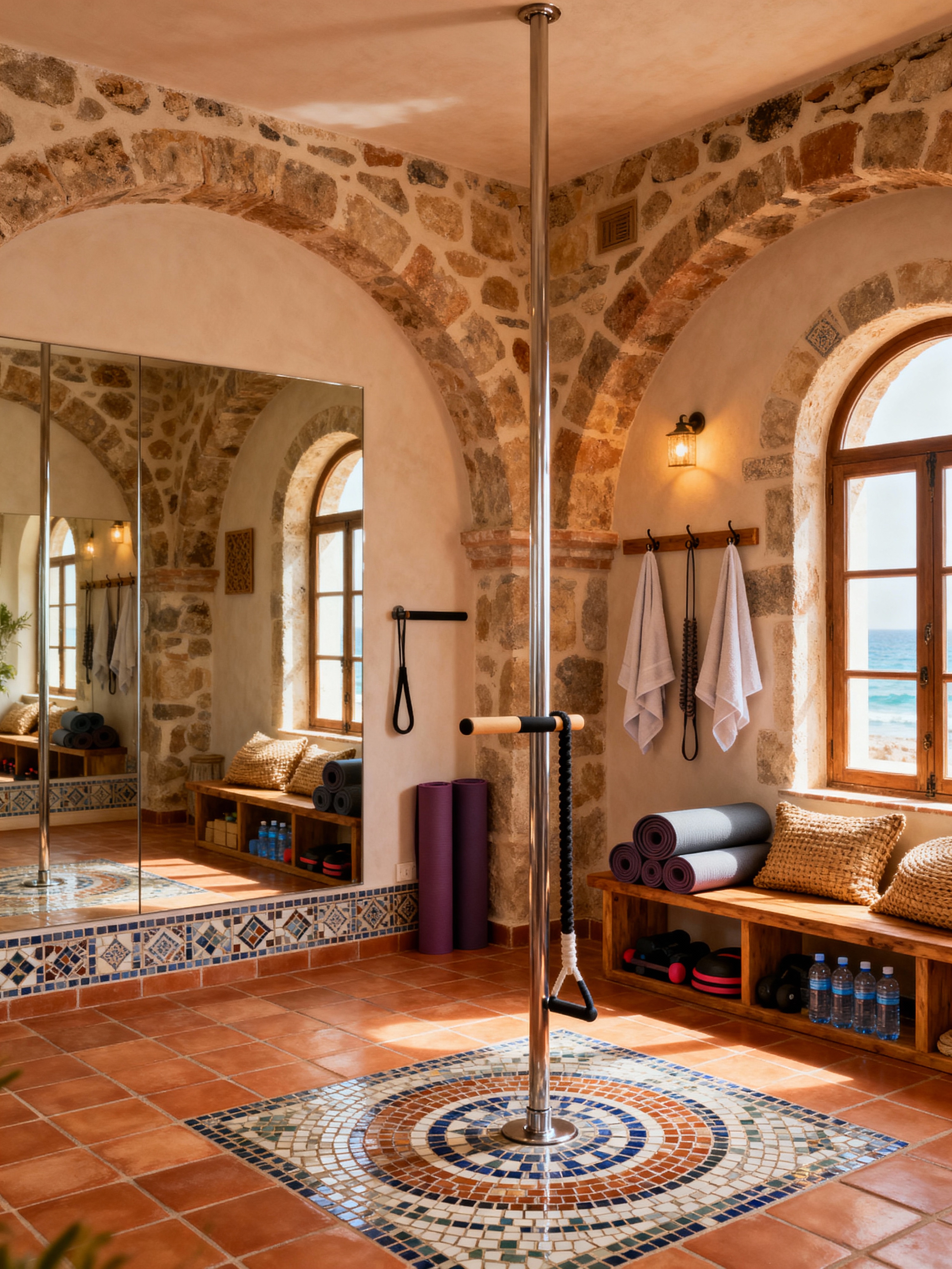 pole dance studio with mediterranean style with mirrors and towels and dim lighting and yoga mats and comfortable seating and grip aids and exercise equipment and water bottles. . with coastal influence and sun-drenched and terracotta tiles and warm earth tones and stone accents and rustic charm and mosaic patterns and arched doorways