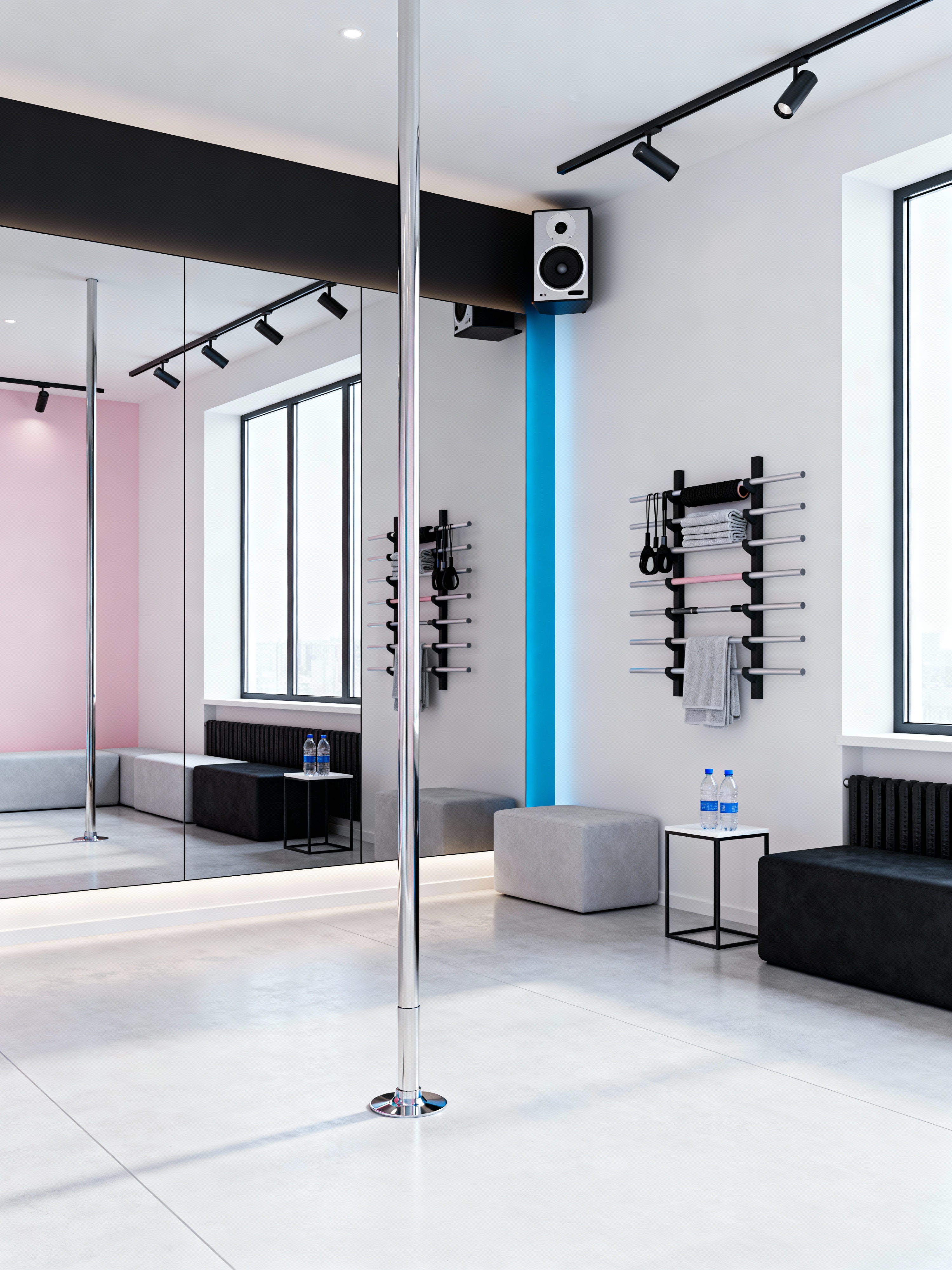 pole dance studio with minimalist style with comfortable seating and mirrors and water bottles and dim lighting and sound system and dance poles and grip aids and towels. . with an open floor plan and clean lines and focus on the shape, colour and texture of just a few of essential elements and lots of light and functional furniture and a monochromatic palette with colour used as an accent and an open floor plan