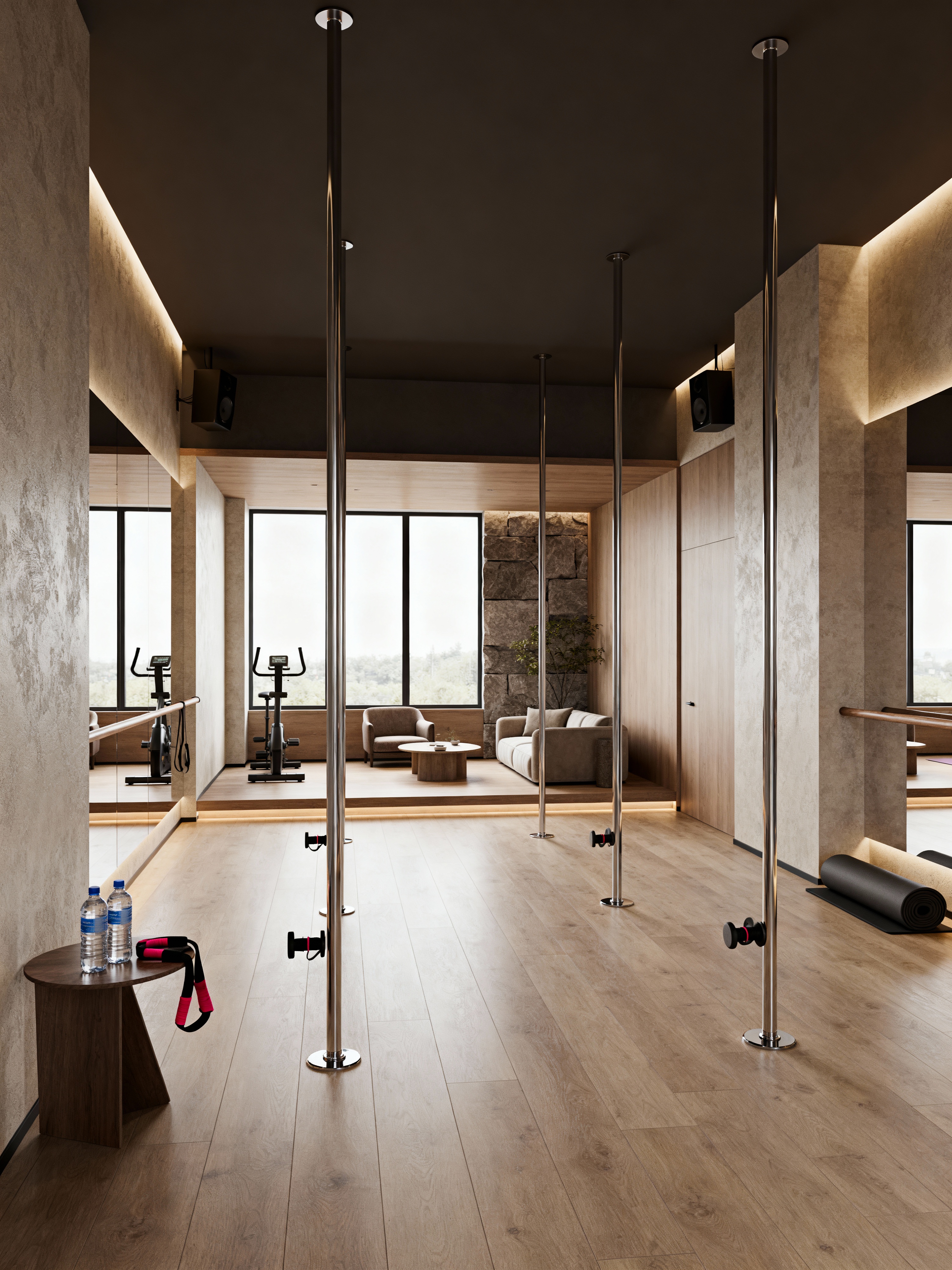 pole dance studio with modern style with exercise equipment and dance poles and water bottles and grip aids and yoga mats and sound system and comfortable seating and dim lighting. . with natural materials and elements and practicality and functionality and open and natural lighting and neutral walls and textures and simple, clean lines and simplistic furniture and natural materials and elements