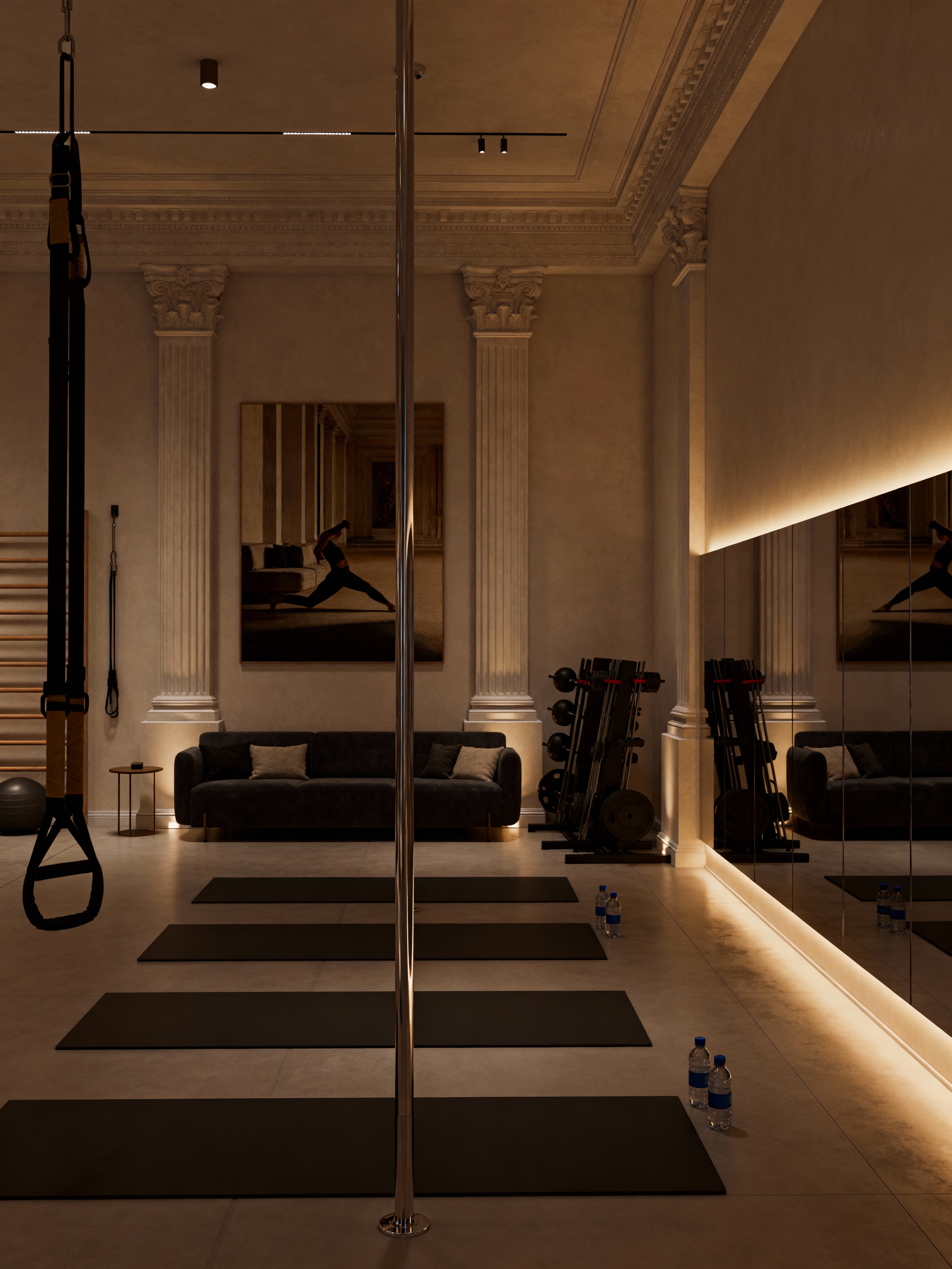 pole dance studio with neoclassic style with grip aids and yoga mats and comfortable seating and exercise equipment and dance poles and mirrors and dim lighting and water bottles. . with timeless furniture and greek columns and thoughtful minimalism and geometric decorative elements and timeless artwork and symmetric layouts and elegant and sophisticated and emphasized horizontal and vertical lines