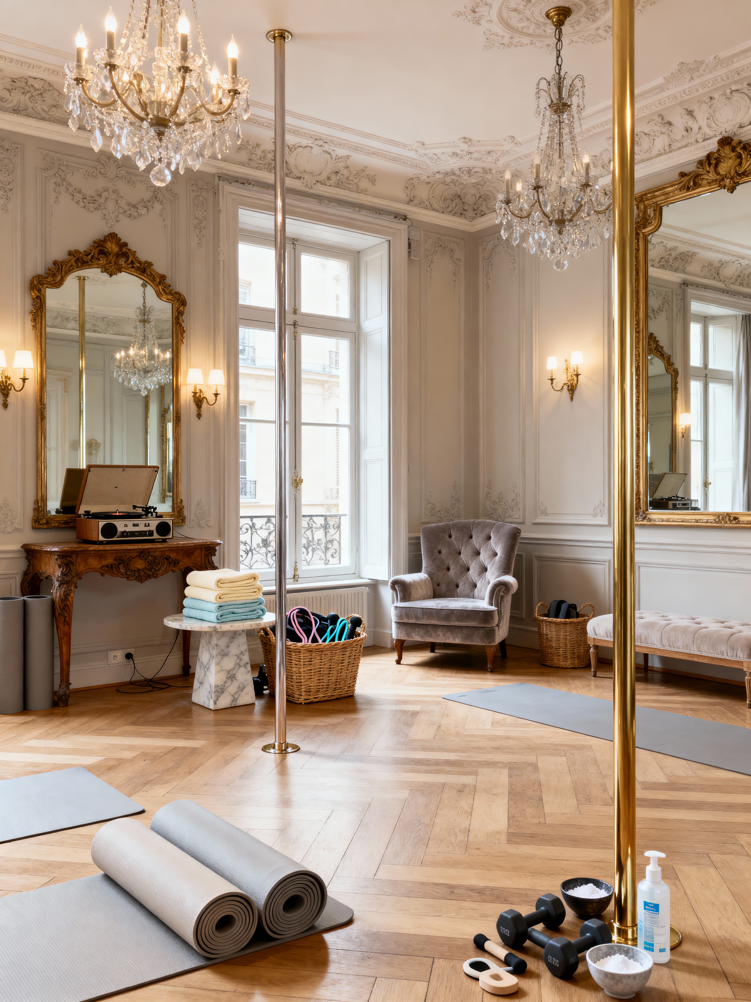 pole dance studio with parisian style with yoga mats and sound system and towels and mirrors and exercise equipment and grip aids and comfortable seating and dance poles. . with refined style and sophisticated charm and ornate moldings and vintage pieces and classic details and antique furniture and european flair and neutral palette