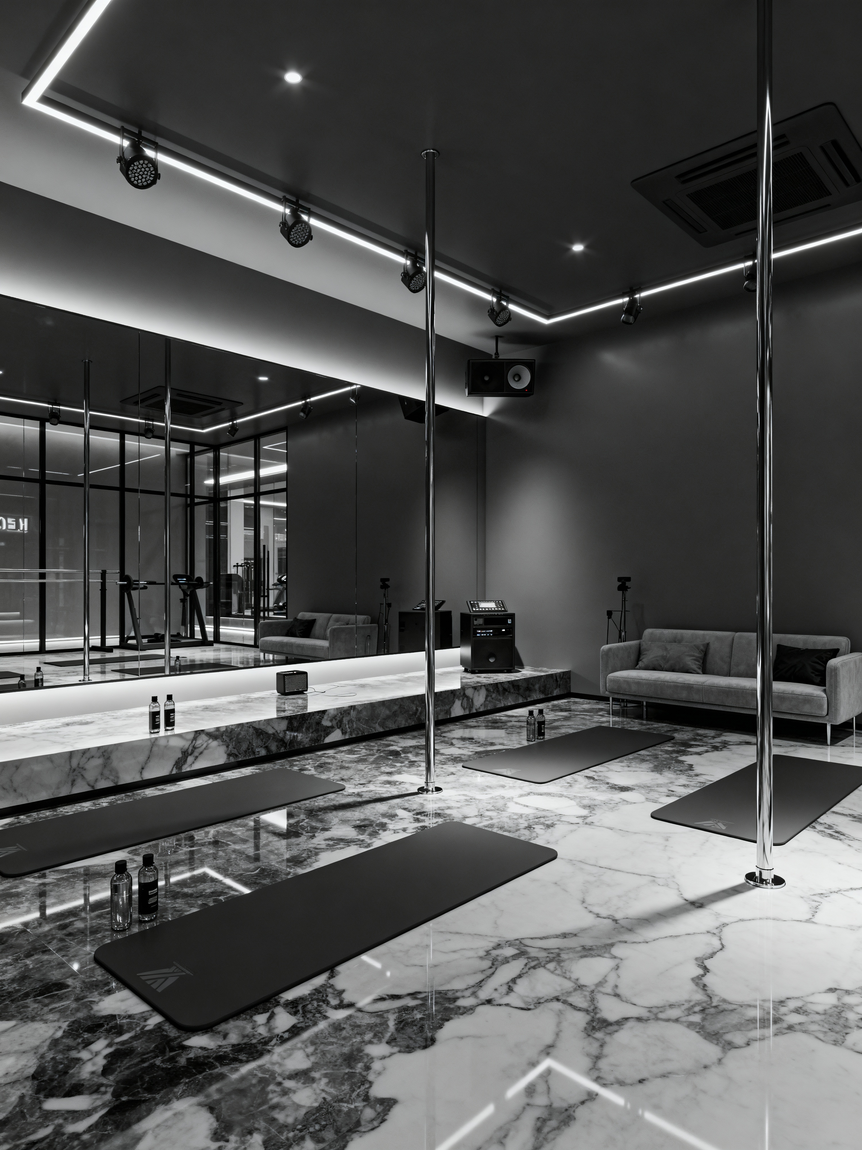 pole dance studio with retro futuristic style with mirrors and yoga mats and dim lighting and dance poles and water bottles and comfortable seating and exercise equipment and sound system. . with minimalist clean lines and smooth polished marble and futurism minimalist interior and floating surfaces and steel finishing and monochromatic palette and futuristic interior and glass panes