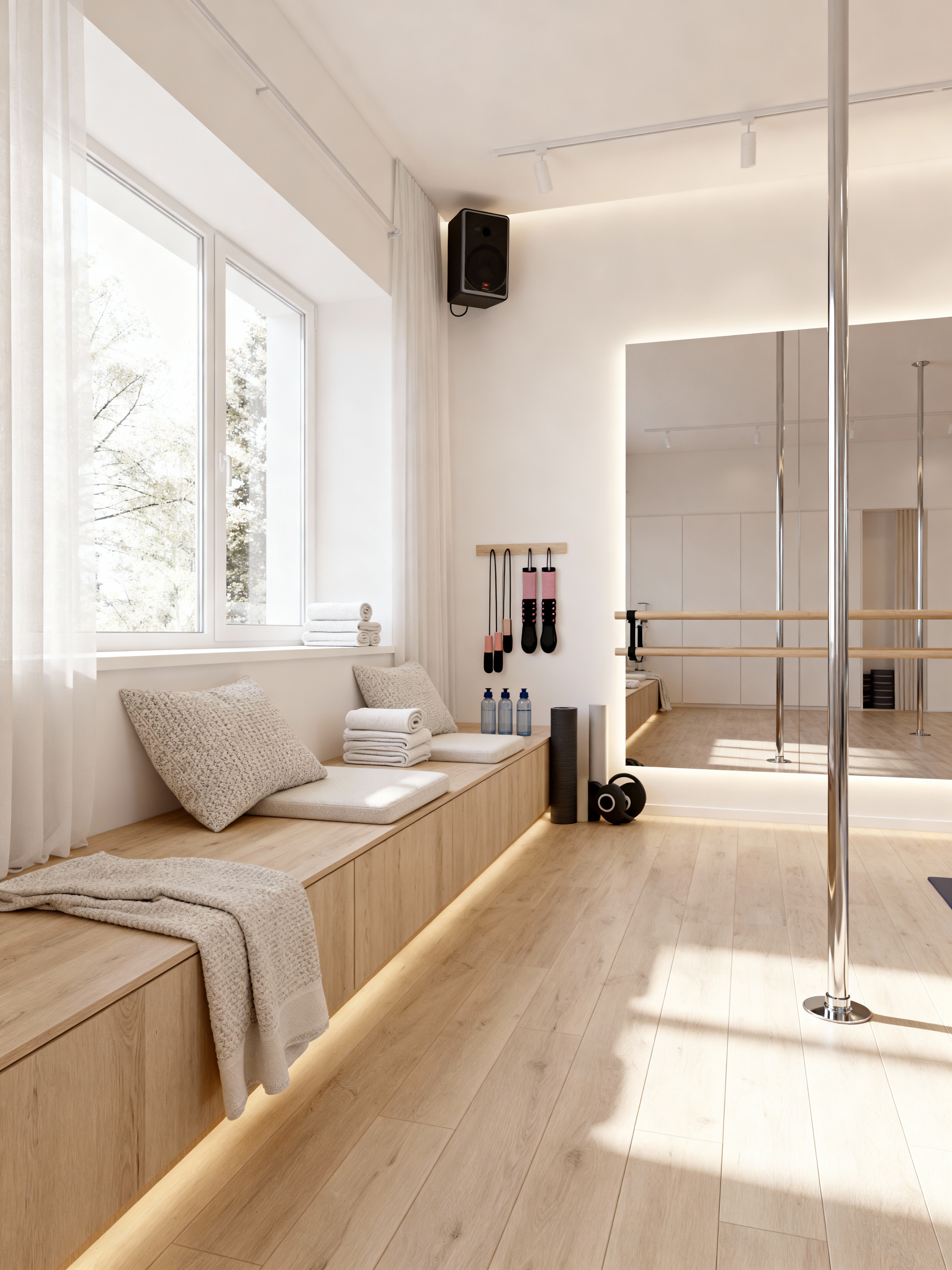 pole dance studio with scandinavian style with comfortable seating and sound system and towels and mirrors and grip aids and dance poles and exercise equipment and water bottles. . with light wood and clean lines and hygge and functional furniture and natural light and minimalist design and textured fabrics and white decor