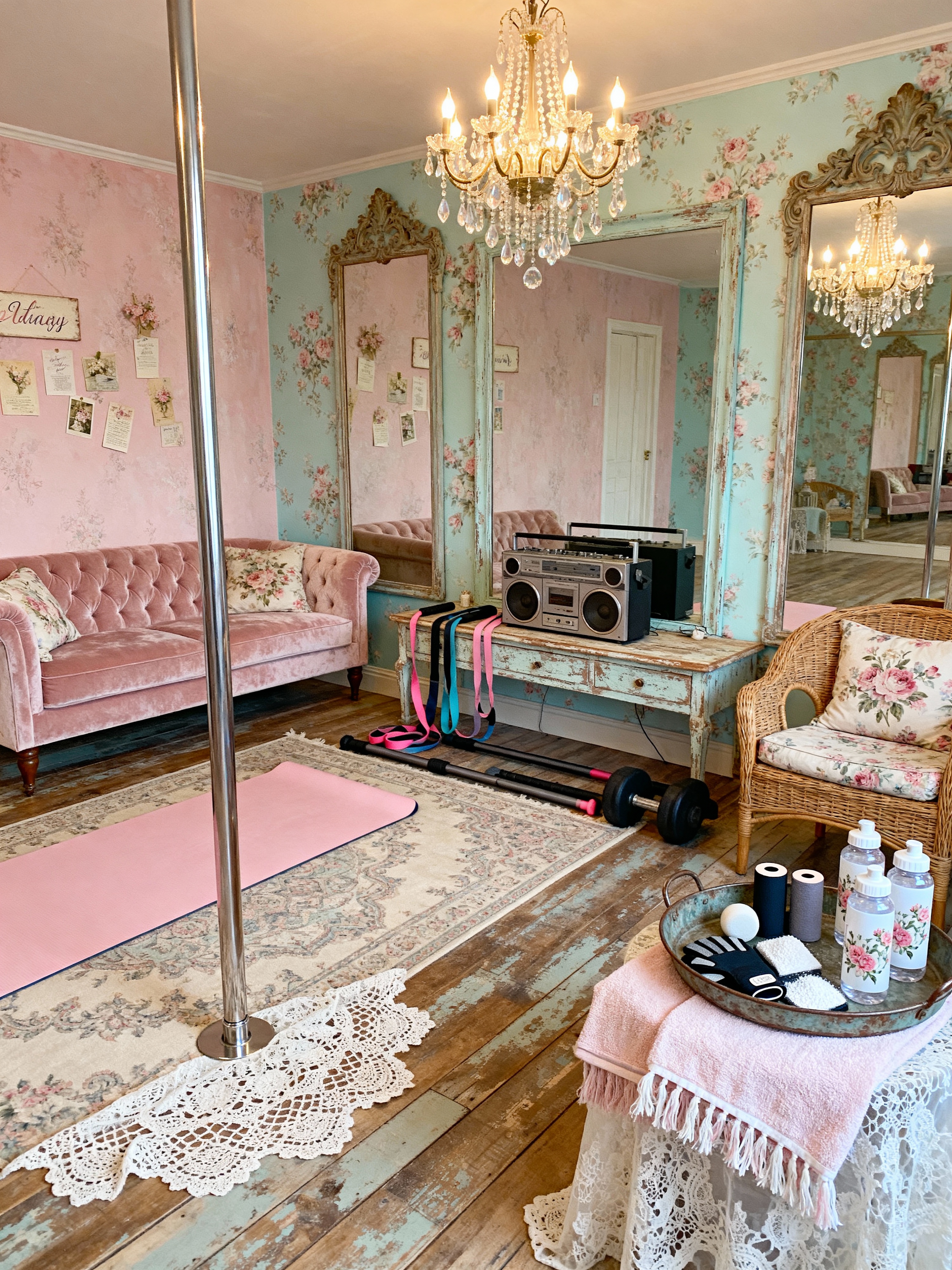pole dance studio with shabby chic style with towels and water bottles and comfortable seating and sound system and mirrors and exercise equipment and dim lighting and grip aids. . with pastel colors and soft textures and antique lace and romantic style and delicate details and feminine touches and distressed furniture and vintage charm