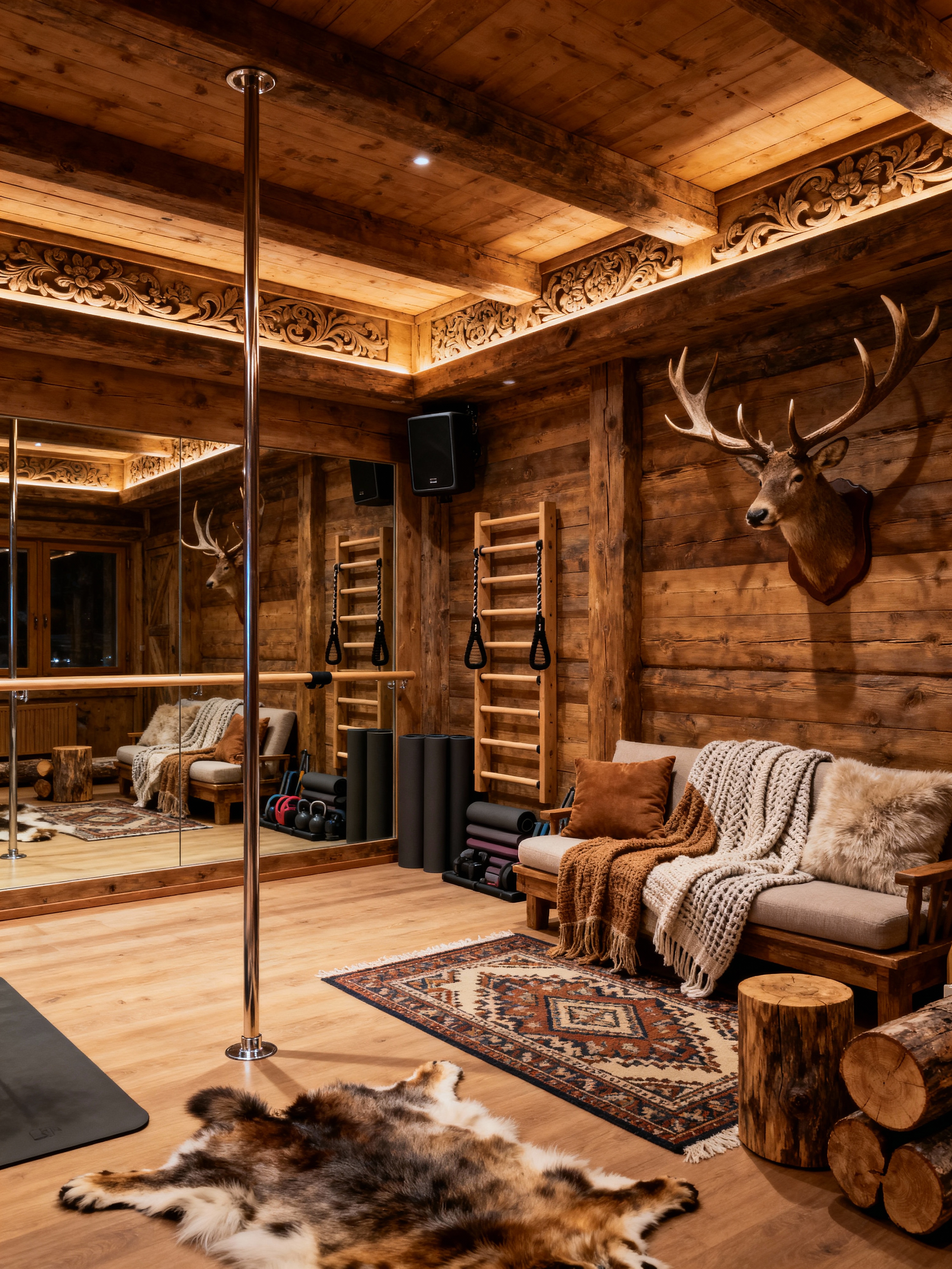 pole dance studio with ski chalet style with mirrors and sound system and yoga mats and exercise equipment and grip aids and comfortable seating and dim lighting and dance poles. . with layered textiles and wooden walls and exposed construction beams and rustic and wooden logs and animal rugs and hanging wall elk antler and decorative carving and mouldings