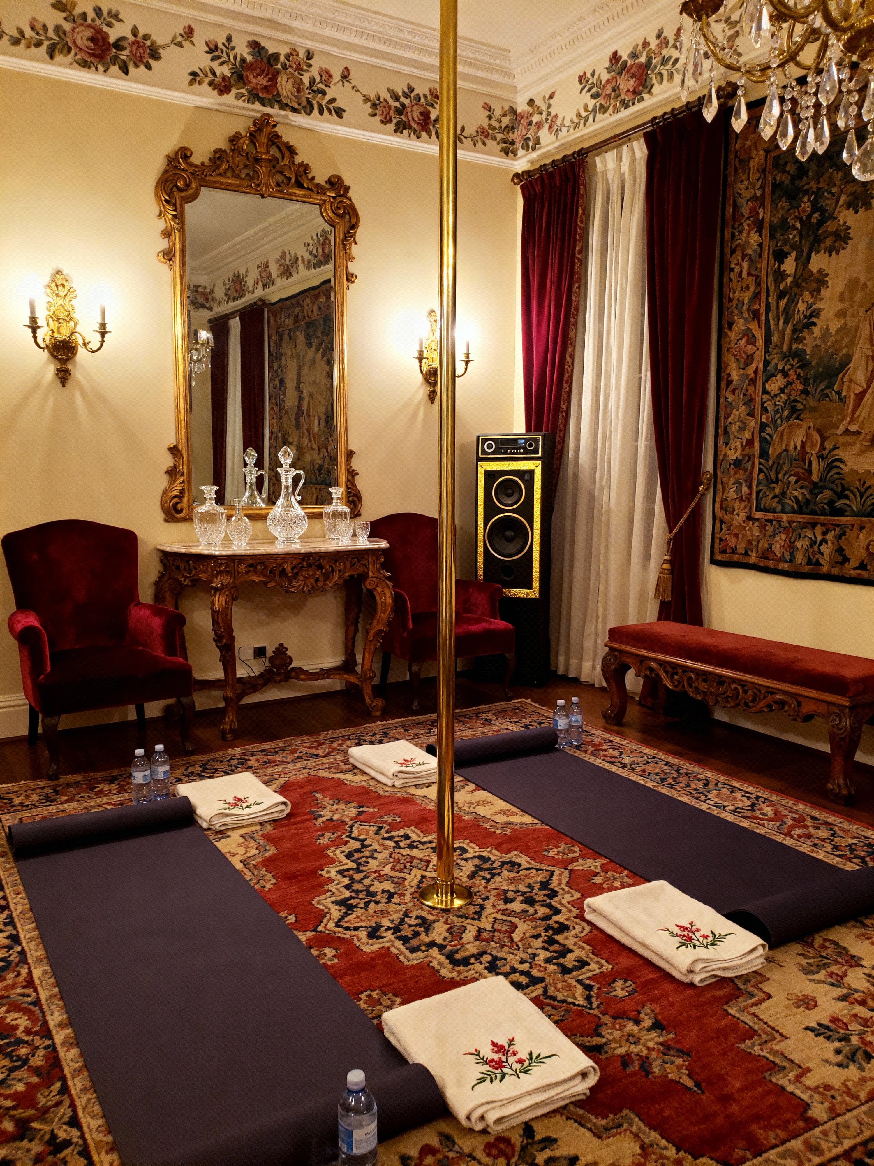 pole dance studio with traditional style with comfortable seating and exercise equipment and water bottles and dim lighting and dance poles and yoga mats and sound system and towels. . with warm colors and ornate details and refined atmosphere and classic elegance and antique pieces and rich fabrics and formal furniture and crown molding