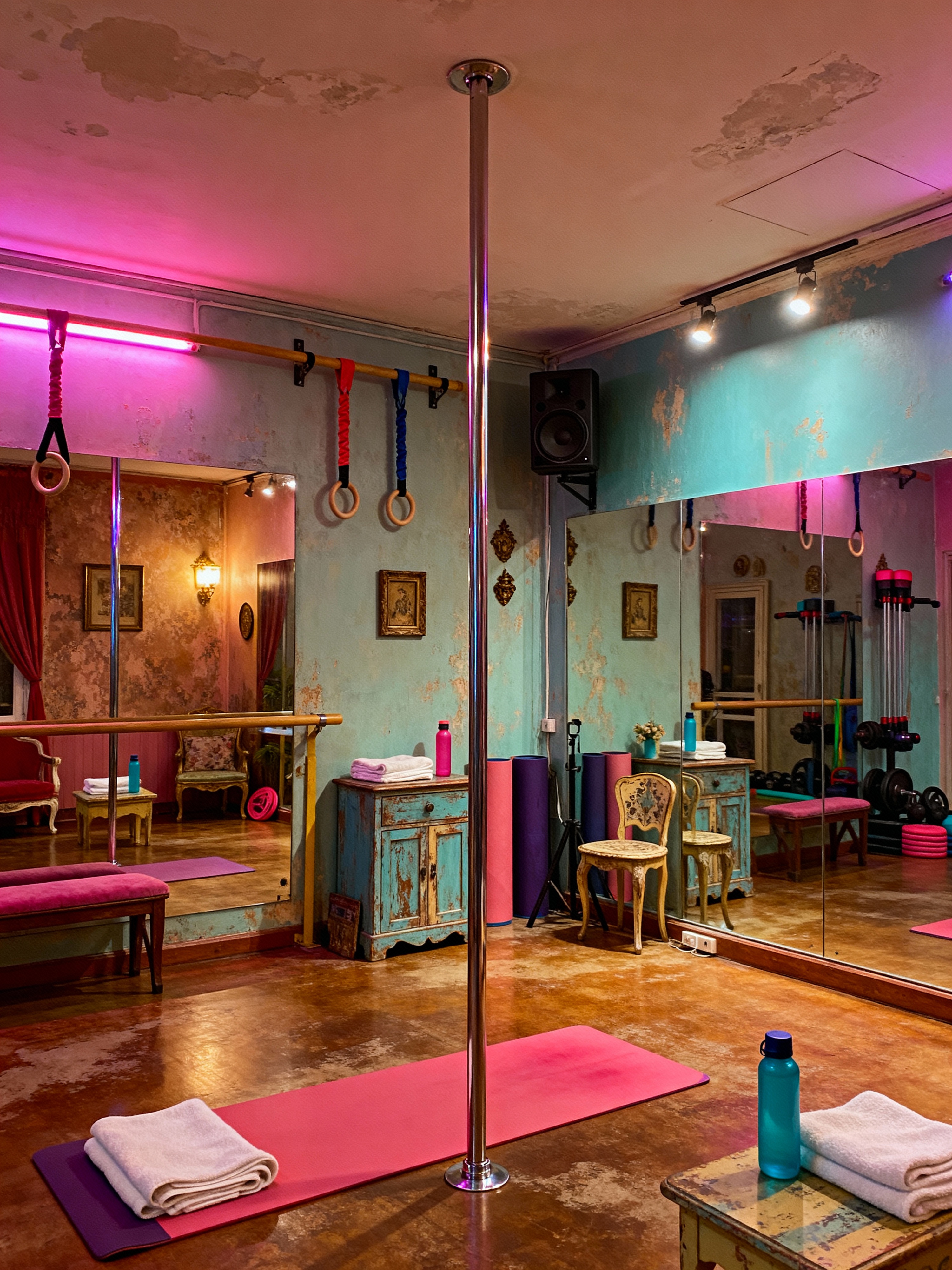 pole dance studio with vintage style with grip aids and sound system and mirrors and exercise equipment and comfortable seating and towels and dim lighting and water bottles. . with timeless pieces and retro style and colorful accents and mid-century and upcycled furniture and shabby chic and nostalgic feel and antique decor