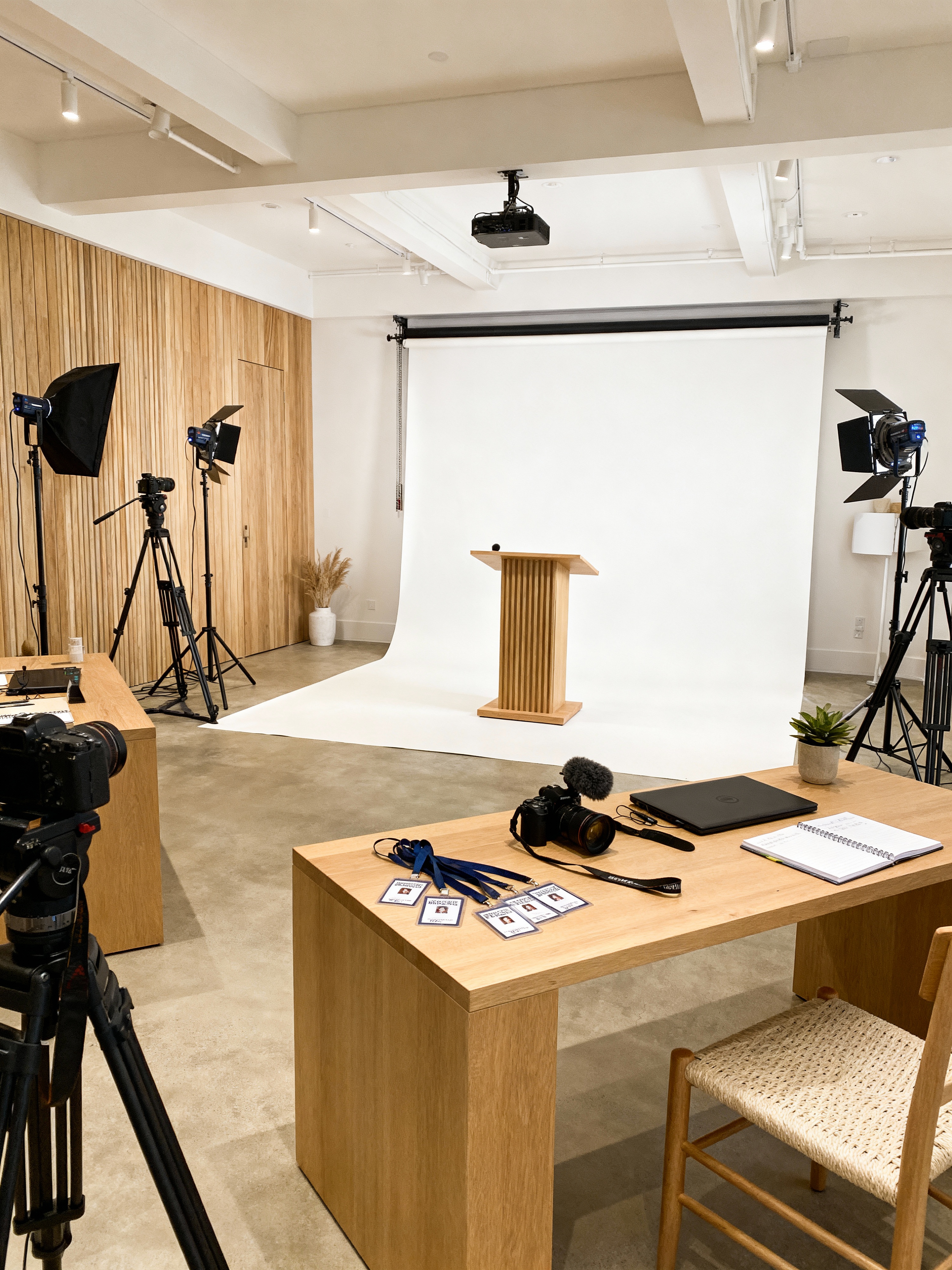 press room with airbnb style with recording equipment and press badges and cameras and notebooks and podium and backdrop and lighting equipment and tripods. . with open and natural lighting and practicality and functionality and scandinavian style and natural materials and elements and simple, clean lines and simplistic furniture and neutral walls and textures and simple color palette and open and natural lighting