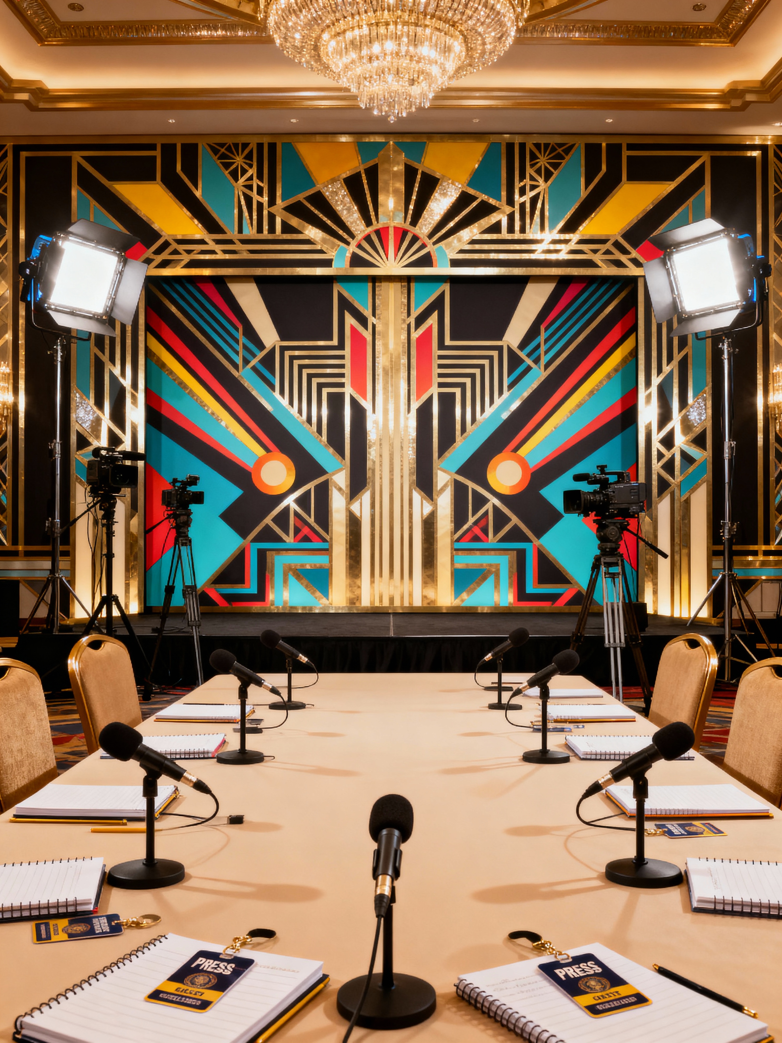 press room with art deco style with notebooks and microphones and cameras and lighting equipment and backdrop and recording equipment and chairs and press badges. . with bold geometry and decadent detail and geometric lines and exuberant shapes and bright and cheerful colors and rich colors and symmetrical designs and abstract patterns
