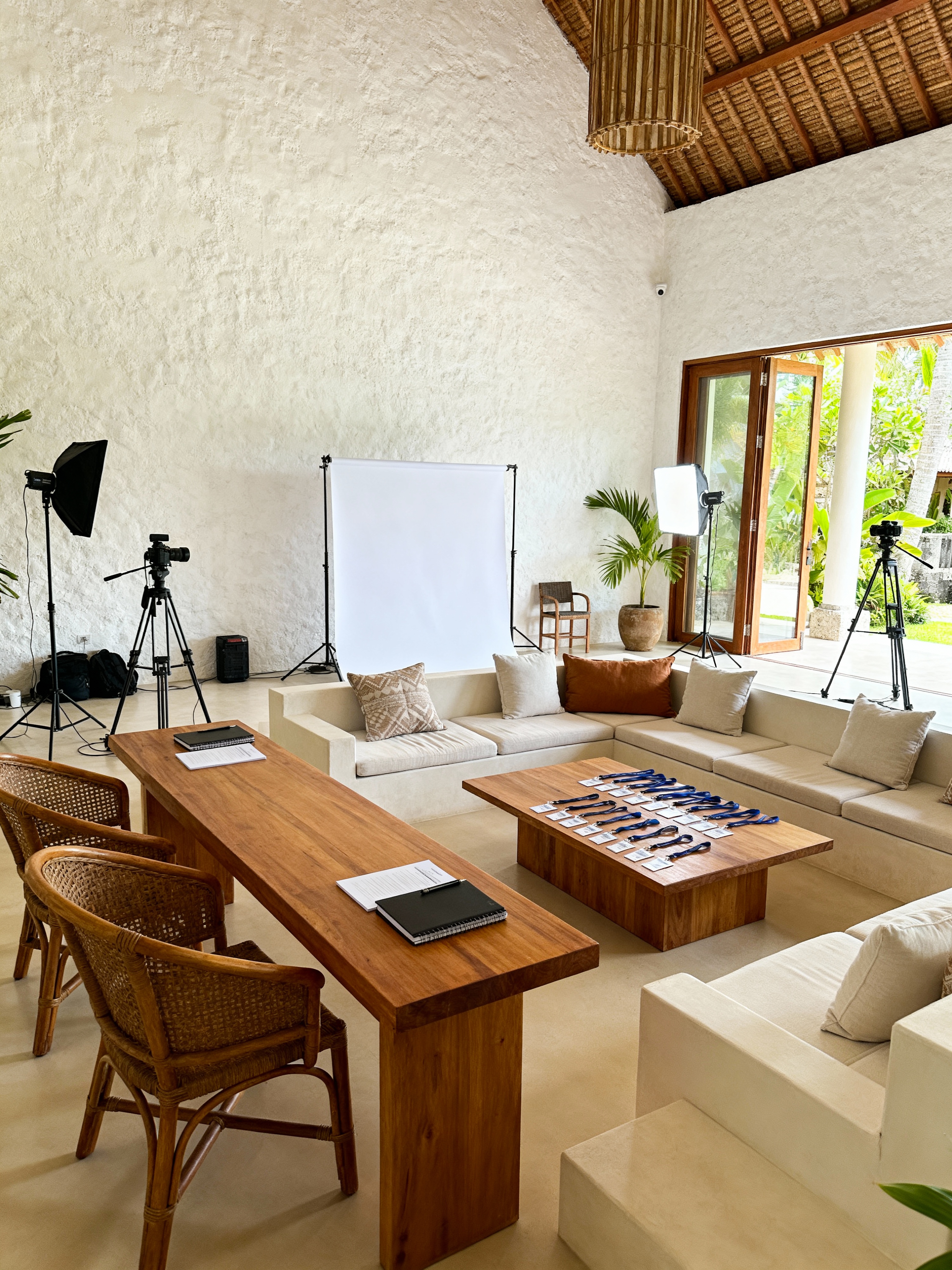 press room with bali style with recording equipment and backdrop and tripods and cameras and chairs and notebooks and lighting equipment and press badges. . with white or cream walls and conversation pit with pillows and low modular sofas and wooden coffee and dining tables and textured plaster or stucco finish and indoor-outdoor flow with glass doors and neutral color palette and calm, minimal, tropical atmosphere