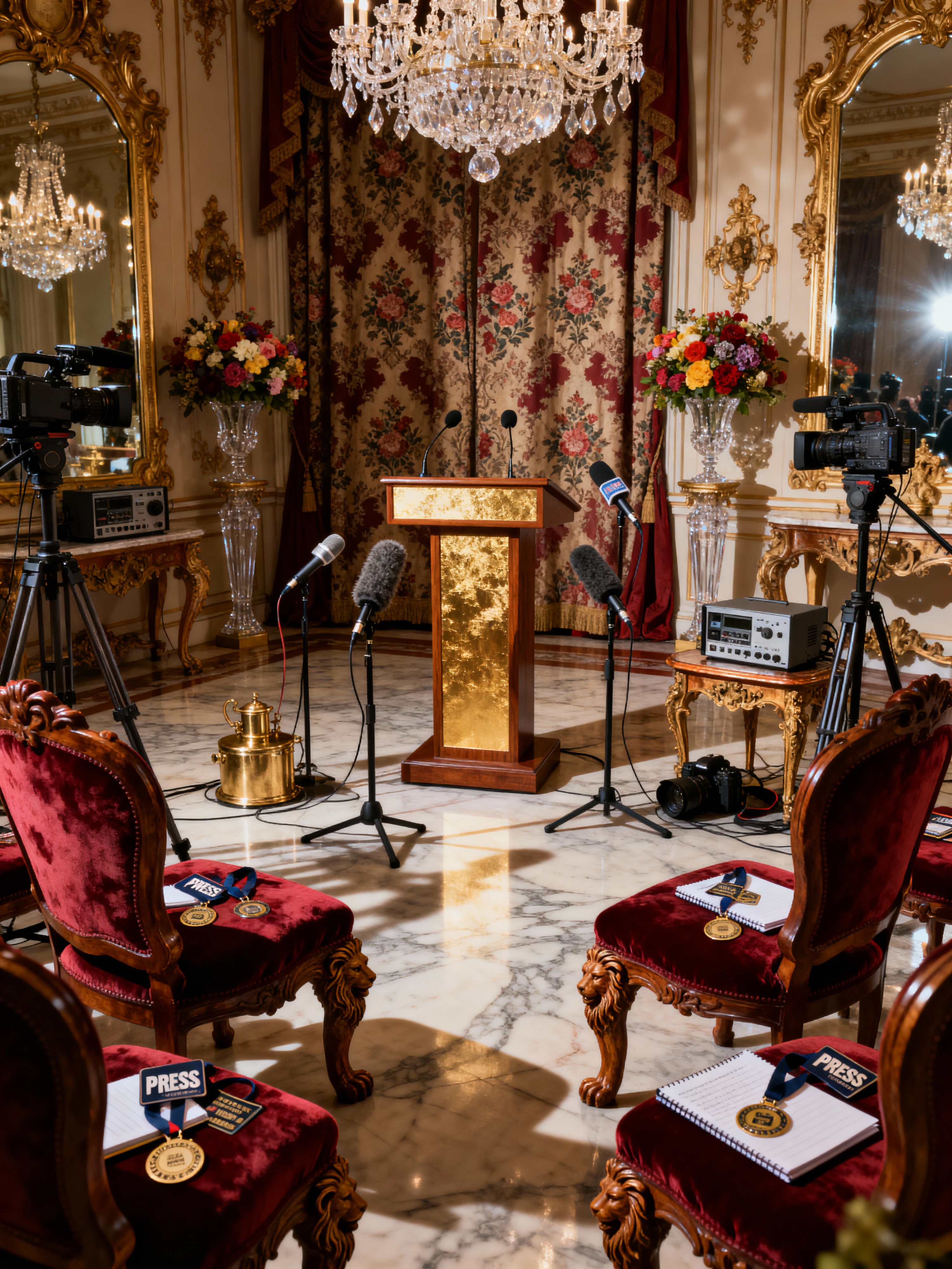 press room with baroque style with podium and chairs and cameras and microphones and recording equipment and backdrop and press badges and notebooks. . with luxurious floral and damask fabrics and drama and dynamism and crystal and glass accents and movement and intricate carvings and ornaments and grandeur and tension