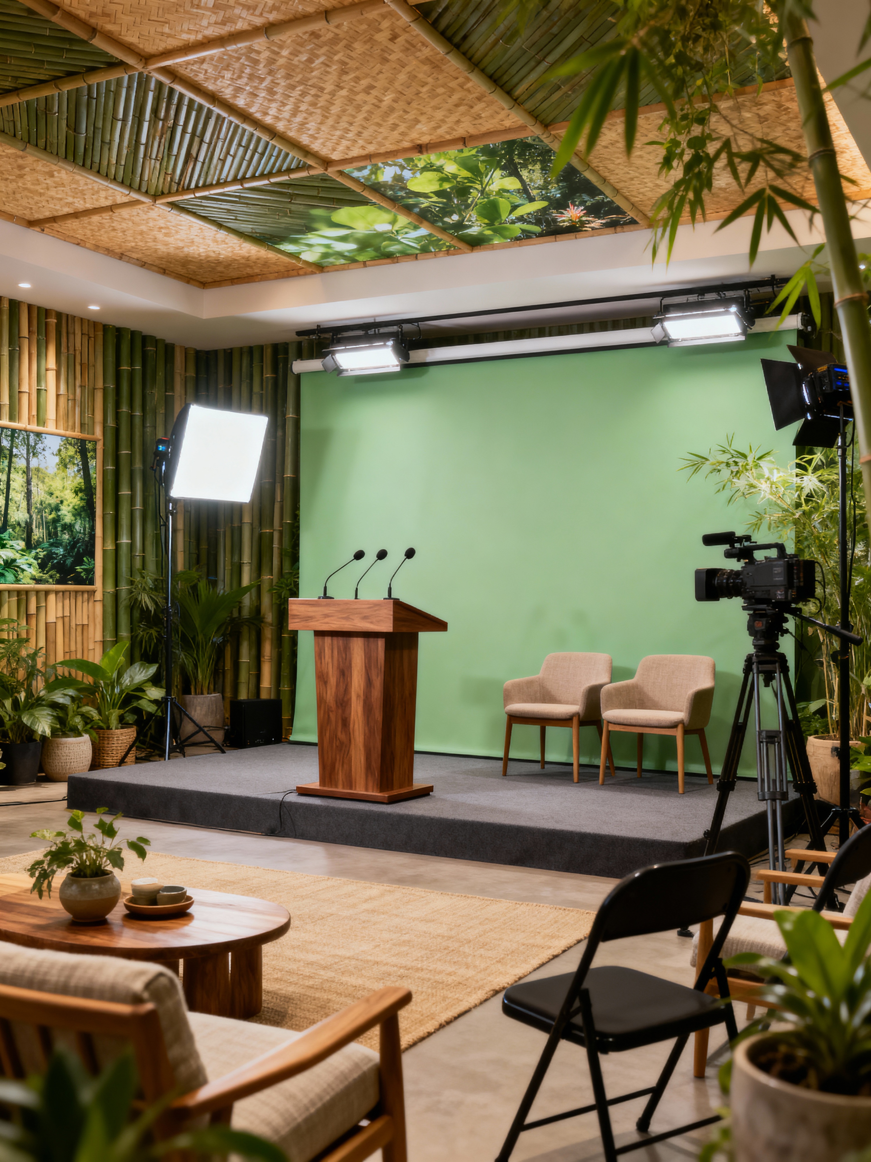 press room with biophilic style with podium and microphones and backdrop and lighting equipment and tripods and chairs and recording equipment and cameras. . with plants and bamboo materials and images of nature and natural elements and linen materials and fresh air and wood materials and ceramic materials