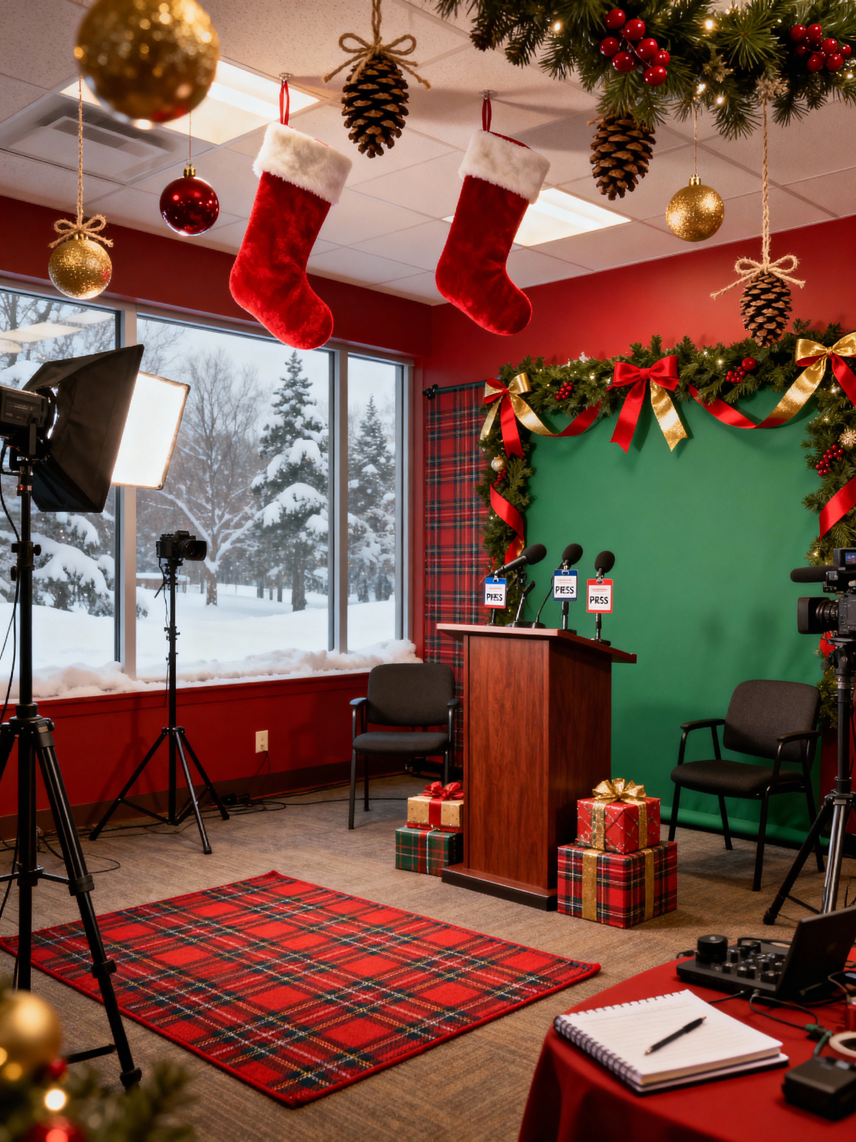 press room with christmas style with tripods and press badges and podium and cameras and backdrop and chairs and notebooks and recording equipment. . with plaid rugs and christmas ornaments and tie pinecones and berries and berries and greenery draped and ribbons and snow outside and a few big socks hanging and giftwrapped gifts